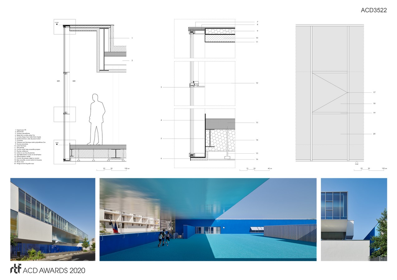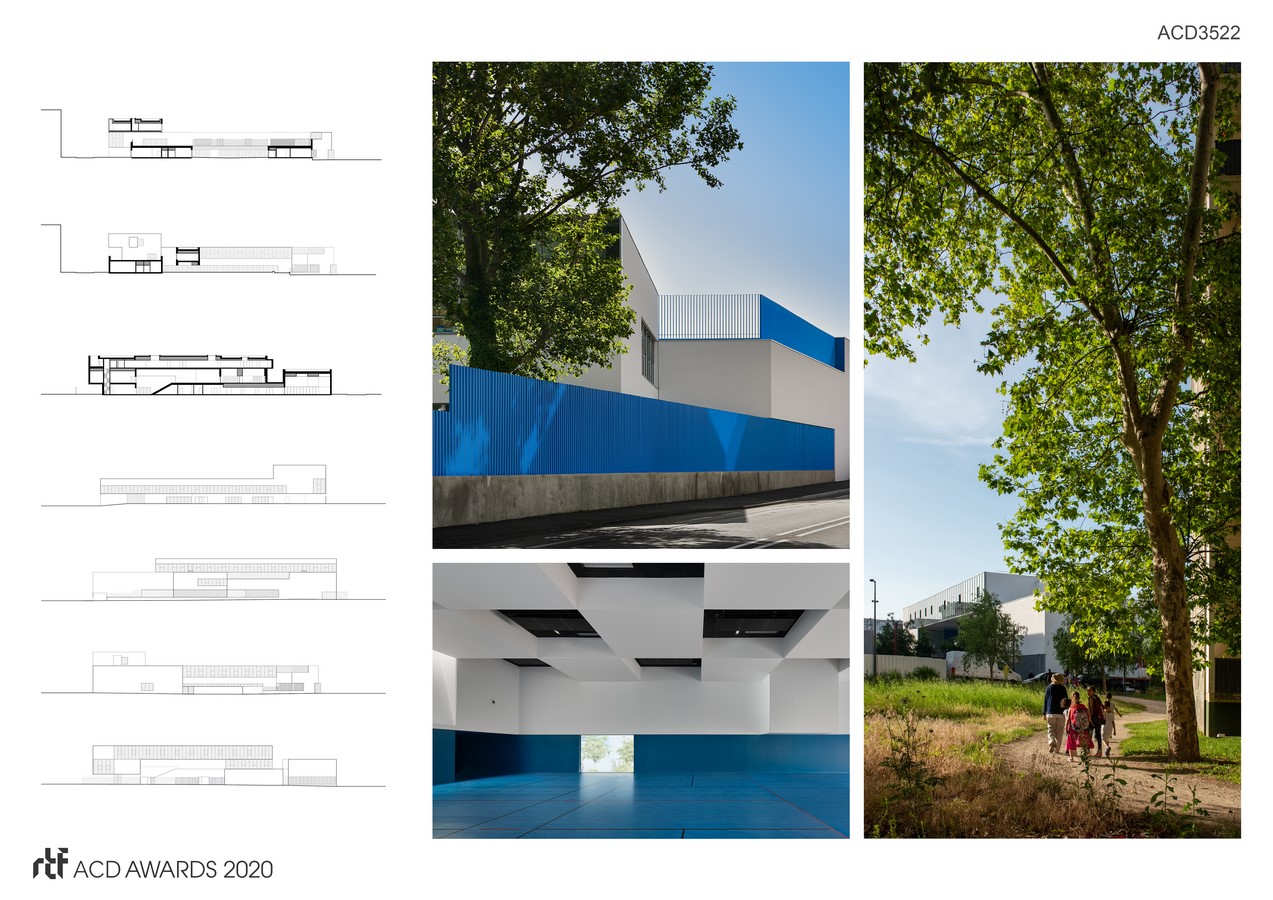 Other Credits: Construction companies : Earthwork, road works (STAL TP), landscape (MANIEBAT SAS), water and misc. networks (STAL TP), structural works, metal frame (EIFFAGE GS – LYON GÉNIE CIVIL, ERTCM), water proofing (APC ÉTANCH’ GRAND LYON), exterior aluminium joinery, solar shading (BLANCHET) external thermic insulation, scaffolding (MONTÉLIMAR FAÇADES, JPE ECHAFAUDAGE, metal works, fencing (BLANCHET), Wood joinery, Furniture (GUILLON), plastering insulation, drop ceiling (SAS NEBIHU), glued floors, sport floor (COURBIERE & FILS), floor and wall tiles (CMM), painting, cleaning (RAVALTEX), elevator (COPAS), electrical high and low voltage (SNEF), plumbing, heating, ventilation (HERVÉ THERMIQUE), kitchen appliances (CUNY PROFESSUINNEL), photovoltaic panels (SOLSTYCE)