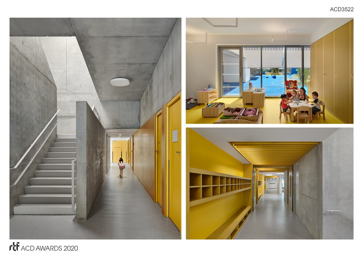 The ground floor is given over to the creche, the sports hall, and the nursery school. To reach the primary school, the pupils must use the large staircase leading to a courtyard area on the upper storey.