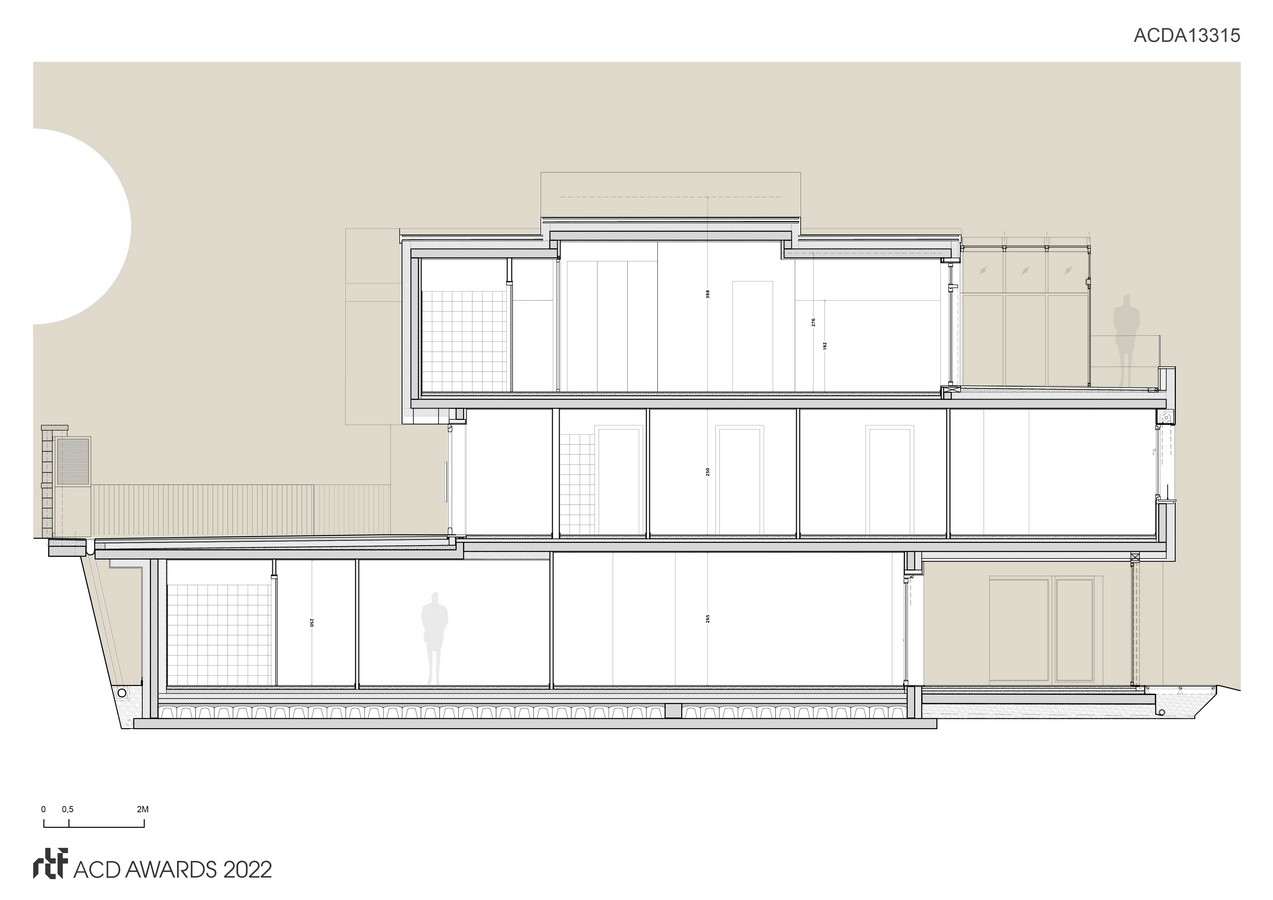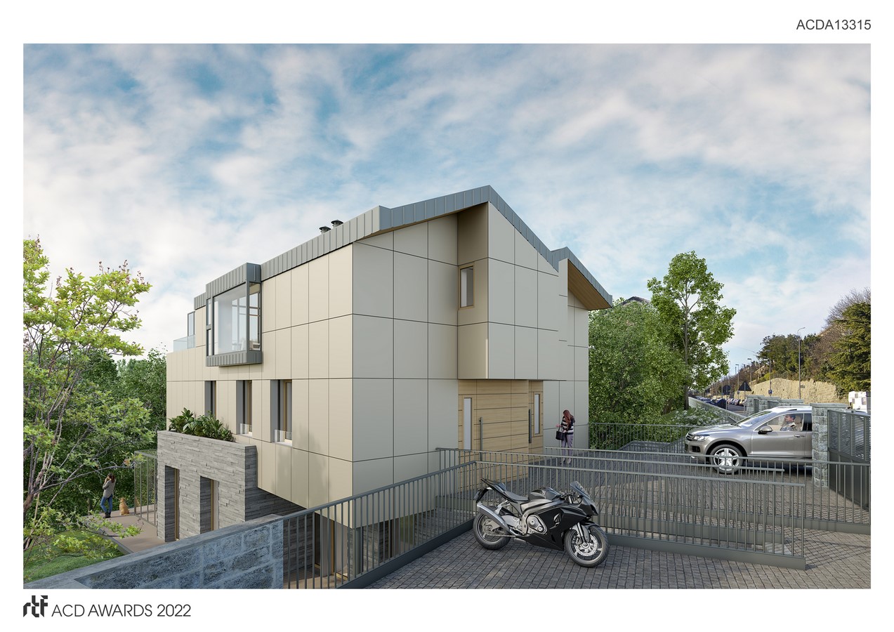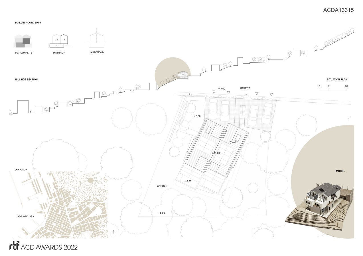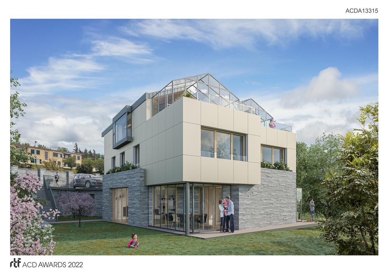 Architectural design fits both the natural and built context, on the one hand through the definition of the volume and its orientation on the hill side, on the other hand by comparing typo-logically with the existing urbanization, and being somehow a contemporary fusion of the both modern and historical nature of local residential settlements.