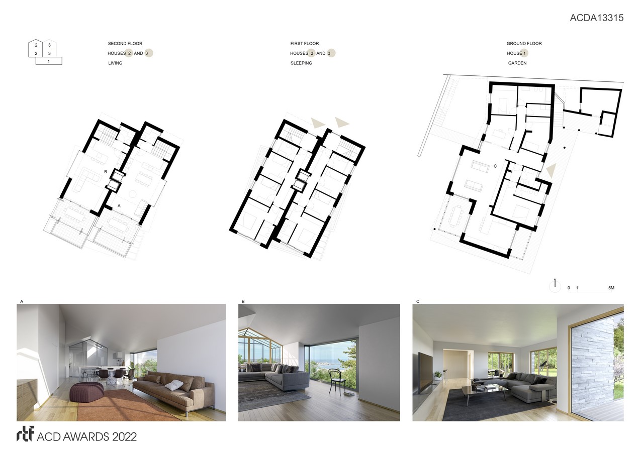 There are 3 houses. “House 1” lays horizontally at the ground floor as a stone-coated basement element with dedicated geometry and structure; the ground floor plan is designed along the natural morphology and contour lines of the area. House “1” has connections with it’s private garden along all facades.