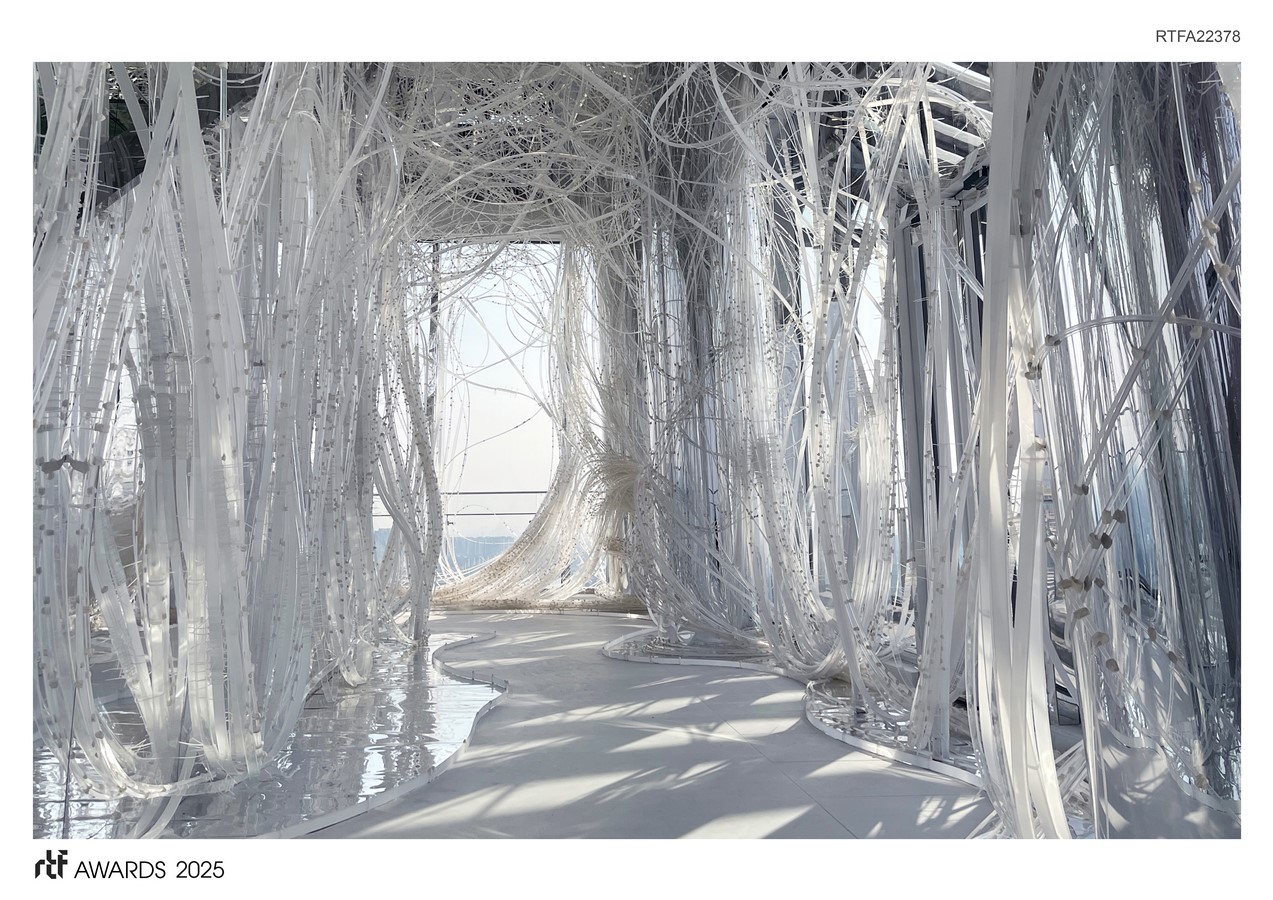 Comprising 33,000 acrylic resin rods spanning 64,000 meters, this installation forms a dynamic structure based on the flexibility and fortuitous power of the material, inspired by trees taking root and growing into a robust system. On this foundation, the xuan paper is applied to the “branches,” imparting a unique spatial experience and evoking a flowering plum forest in snow.