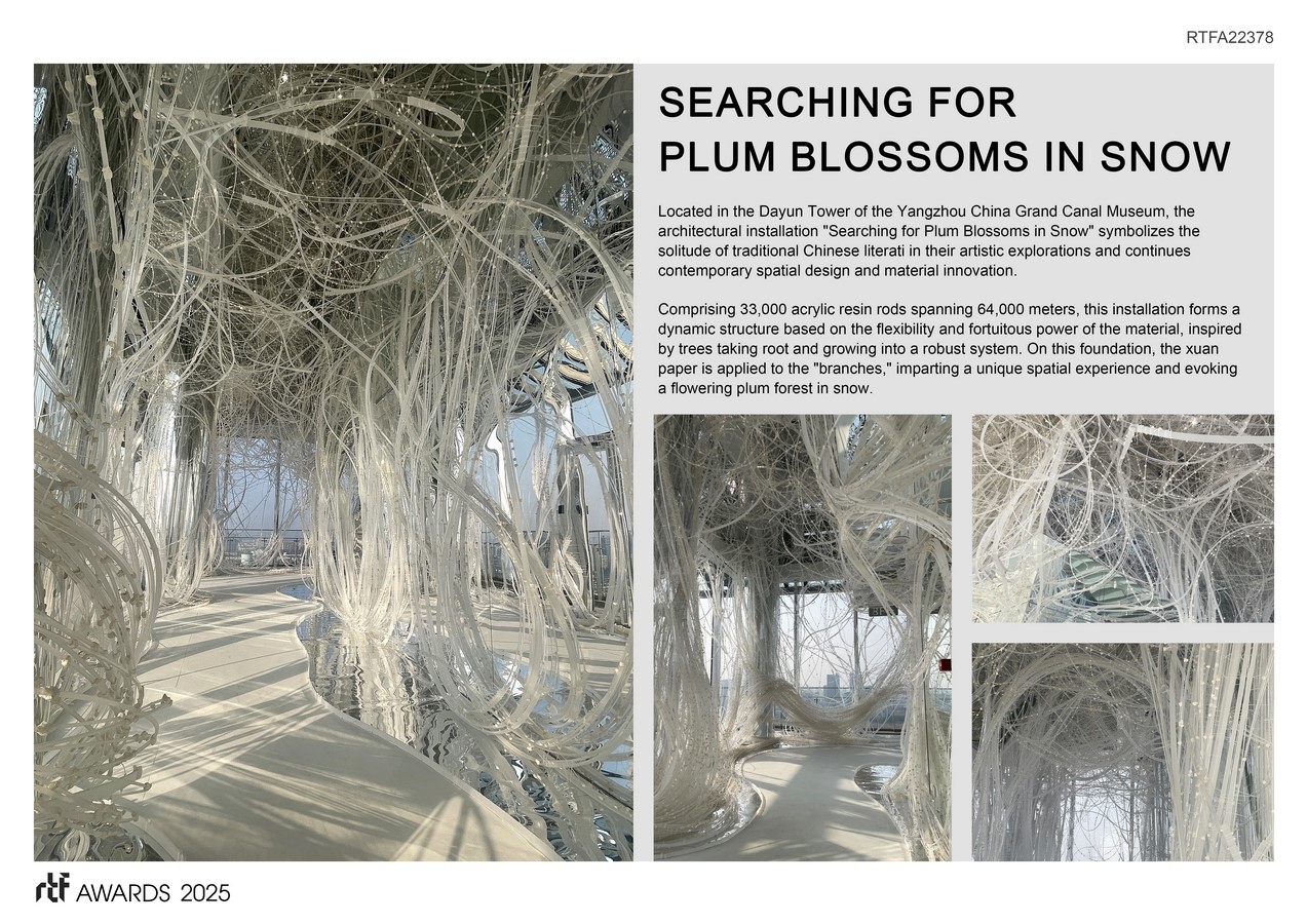 Located in the Dayun Tower of the Yangzhou China Grand Canal Museum, the architectural installation “Searching for Plum Blossoms in Snow” symbolizes the solitude of traditional Chinese literati in their artistic explorations and continues contemporary spatial design and material innovation.
