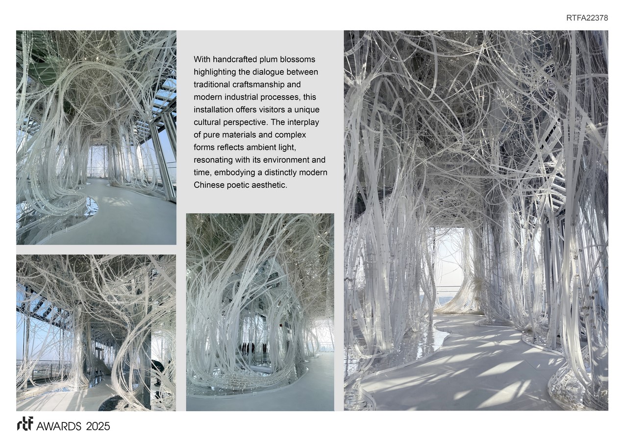 With handcrafted plum blossoms highlighting the dialogue between traditional craftsmanship and modern industrial processes, this installation offers visitors a unique cultural perspective. The interplay of pure materials and complex forms reflects ambient light, resonating with its environment and time, embodying a distinctly modern Chinese poetic aesthetic.
