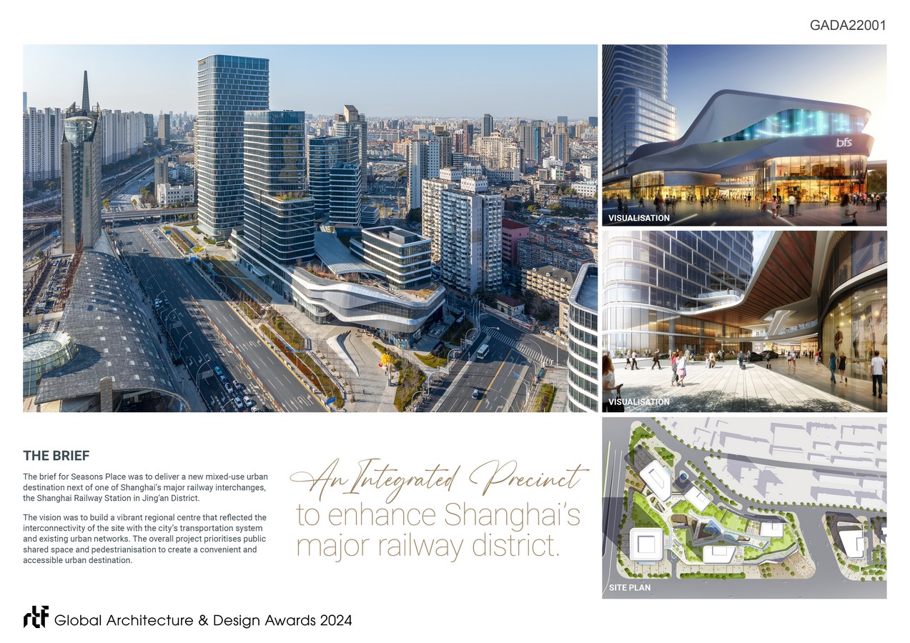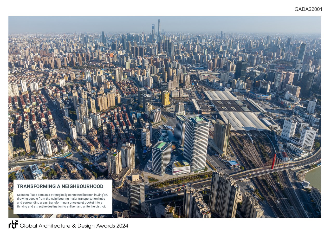 The brief for Seasons Place was to deliver a new mixed-use urban destination next of one of Shanghai’s major railway interchanges, the Shanghai Railway Station in Jing’an District.