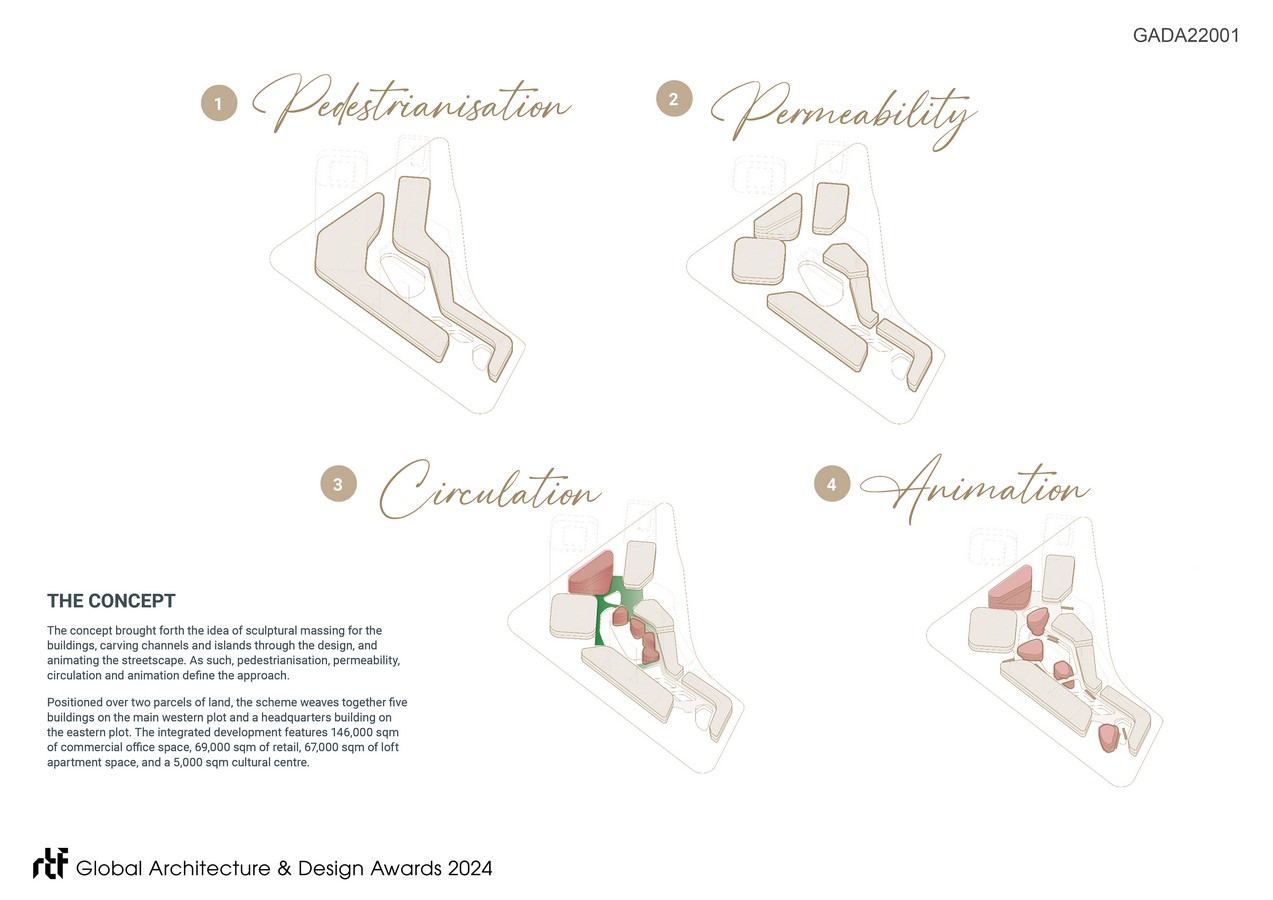 Positioned over two parcels of land, the scheme weaves together five buildings on the main western plot, and a headquarters building on the eastern plot. The integrated development features 146,000 sqm of commercial office space, 69,000 sqm of retail, 67,000 sqm of loft apartment space, and a 5,000 sqm cultural centre.
