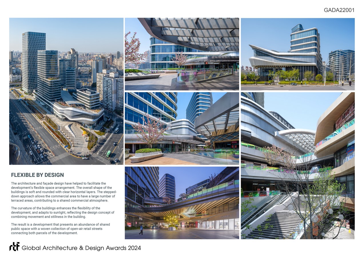 The curvature of the buildings enhances the flexibility of the development, and adapts to sunlight, reflecting the design concept of combining movement and stillness in the building.