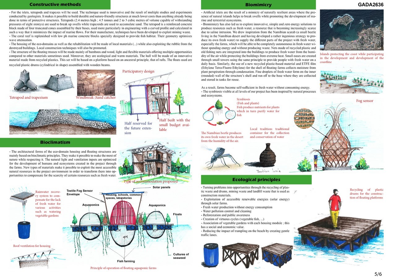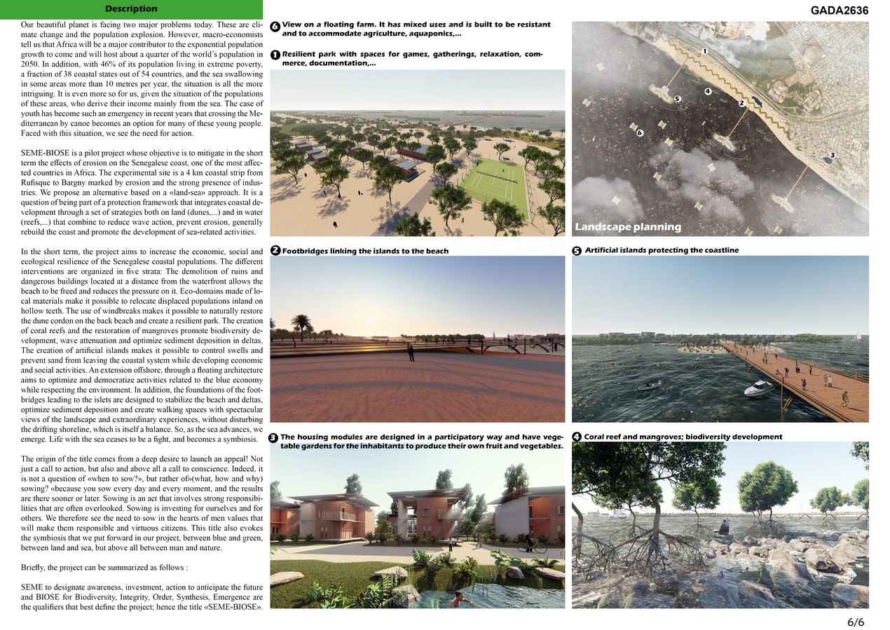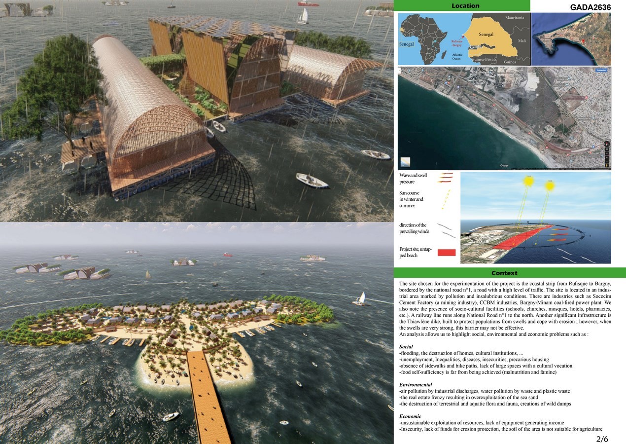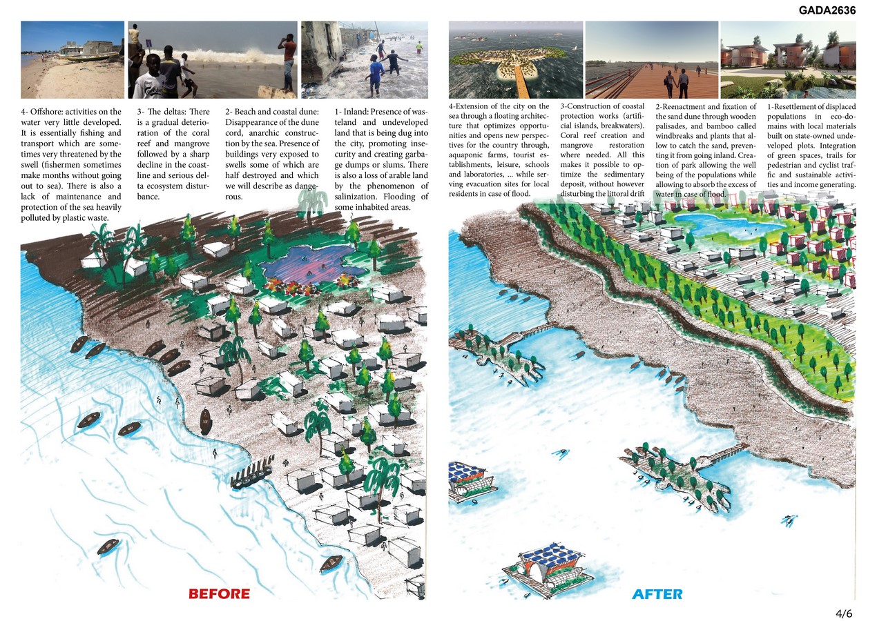 The use of windbreaks makes it possible to naturally restore the dune cordon on the backshore and create a resilient park. The creation of coral reefs and the restoration of mangroves promote biodiversity development, wave attenuation and optimize sediment deposition in deltas. The creation of artificial islands makes it possible to break swells and prevent sand from leaving the coastal system while developing economic and social activities. An extension offshore, through a floating architecture aims to optimize activities related to the blue economy while respecting the environment. So, as the sea advances, we emerge. Life with the sea ceases to be a battle, and becomes a symbiosis.