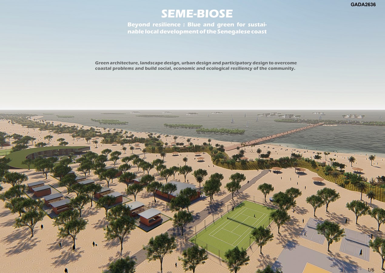 SEME-BIOSE is a pilot project where we propose an alternative based on a “land-sea” approach. It is a question of being part of a protection framework that integrates coastal development through a set of strategies both on land (dunes, …) and in water (reefs, …) that will reduce wave action, prevent erosion, generally rebuild the coast and promote the blue economy. The project aims to build the economic, social and ecological resilience of the populations of the Senegalese coast. The different interventions are organized in five strata: The demolition of the ruins and dangerous buildings near the waterfront will free up the beach and reduce the pressure on it. Eco-domains made of local materials make it possible to resettle displaced populations inland on hollow teeth.