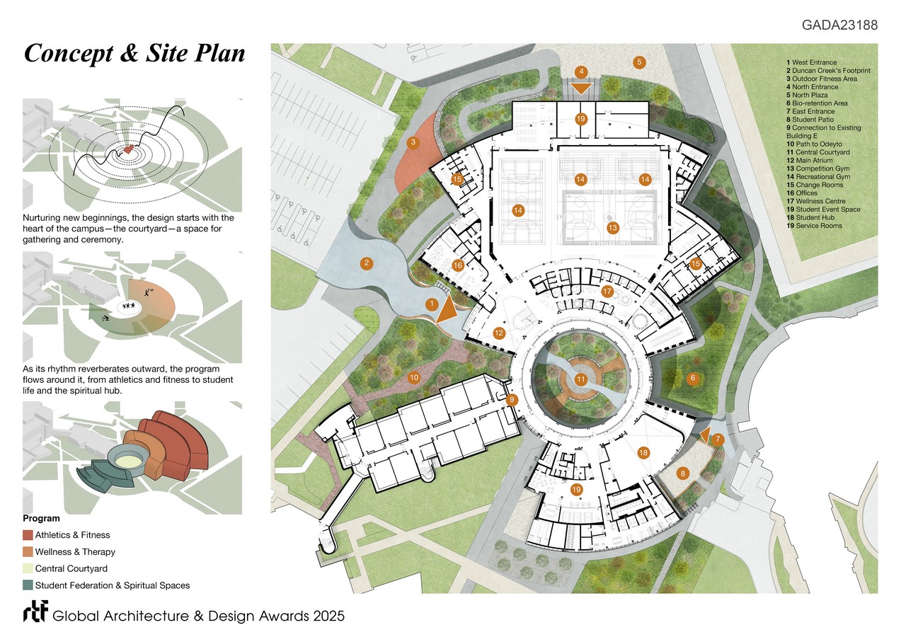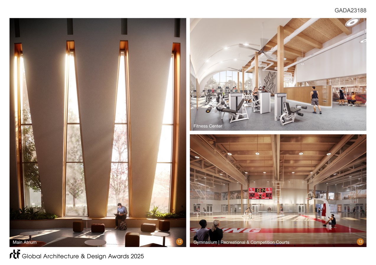 The central courtyard, a place for gathering and ceremony, forms the heart of the design. Its rhythm reverberates outward, shaping five rings that hold a vibrant mix of spaces designed to encourage participation and connection. A 1,000-seat competition and event venue anchors the program, complemented by recreation gyms, studios, therapy and counselling suites, and multipurpose wellness areas. Student life finds new expression in lounges, kitchens, and gathering spaces animated by the Seneca Student Federation.