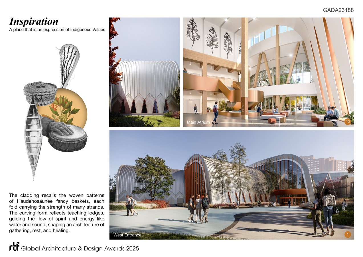 The architectural expression draws from listening; Talking Circles with our Indigenous Advisory Circles and incorporating knowledge shared from students and stewards of Turtle Island, weaving symbolism and narrative into forms, patterns, materials, and spatial experiences.