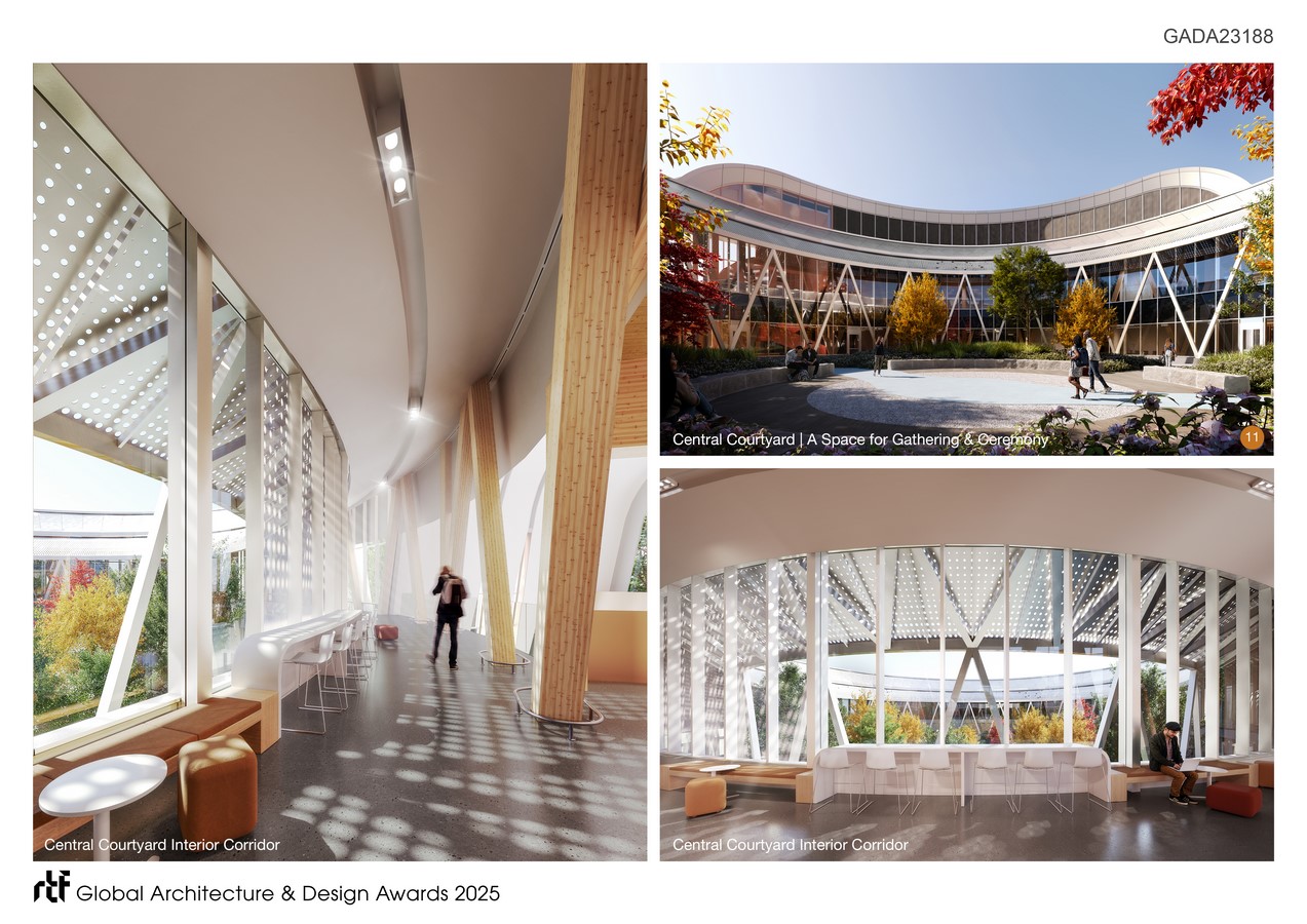The design speaks to both tradition and transformation. Working with Two Row Architect, the building incorporates Indigenous values of stewardship, inclusivity, and respect for the natural world, while embracing advanced sustainable technologies. Rooted in respect for the land, the project harmonizes with its surroundings, honouring natural topographies and ecosystems. A radial grid, alignment with the cardinal directions, and a scheme that reflects the buried creek are central to the design. East and west entrances align with the site’s buried Duncan creek’s footprint, while the seven grandparent teachings procession, an exterior stepped planting feature with year-round plantings of native species and traditional medicines, root the project back to the land.