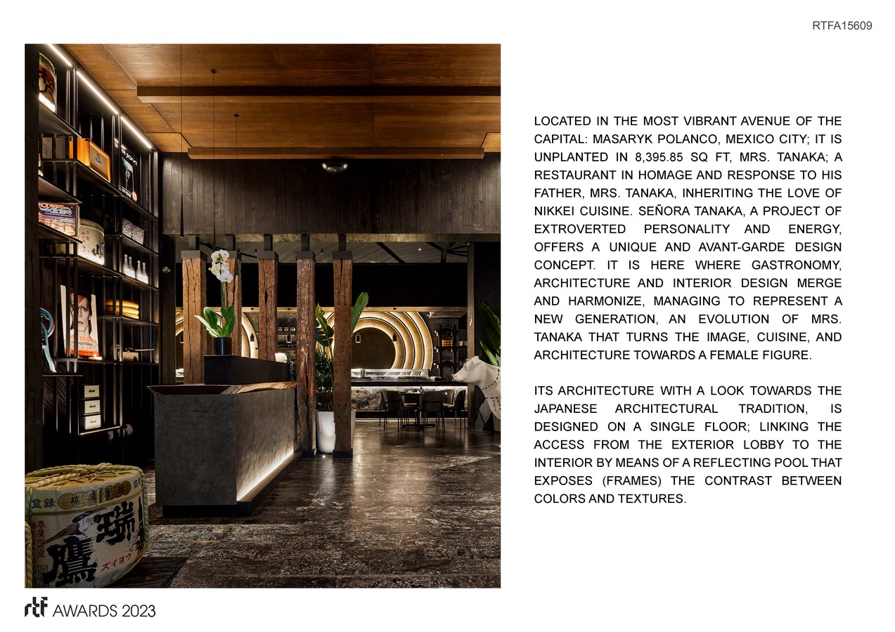Located in the most vibrant avenue of the capital: Masaryk Polanco, Mexico City; it is unplanted in 8,395.85 sq ft, Mrs. Tanaka; a restaurant in homage and response to his father, Mrs. Tanaka, inheriting the love of Nikkei cuisine. Señora Tanaka, a project of extroverted personality and energy, offers a unique and avant-garde design concept. It is here where gastronomy, architecture and interior design merge and harmonize, managing to represent a new generation, an evolution of Mrs. Tanaka that turns the image, cuisine, and architecture towards a female figure.