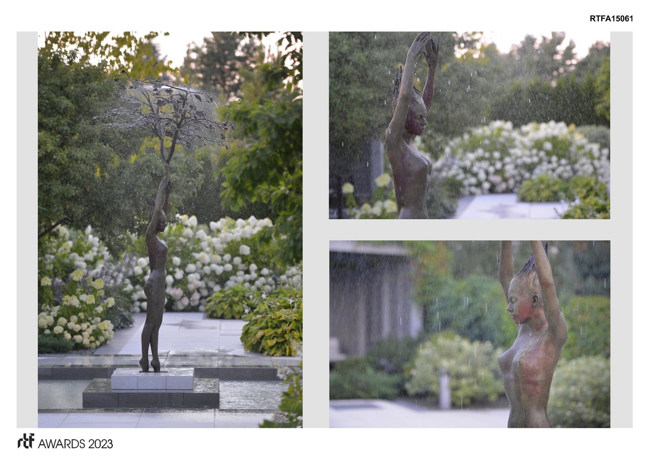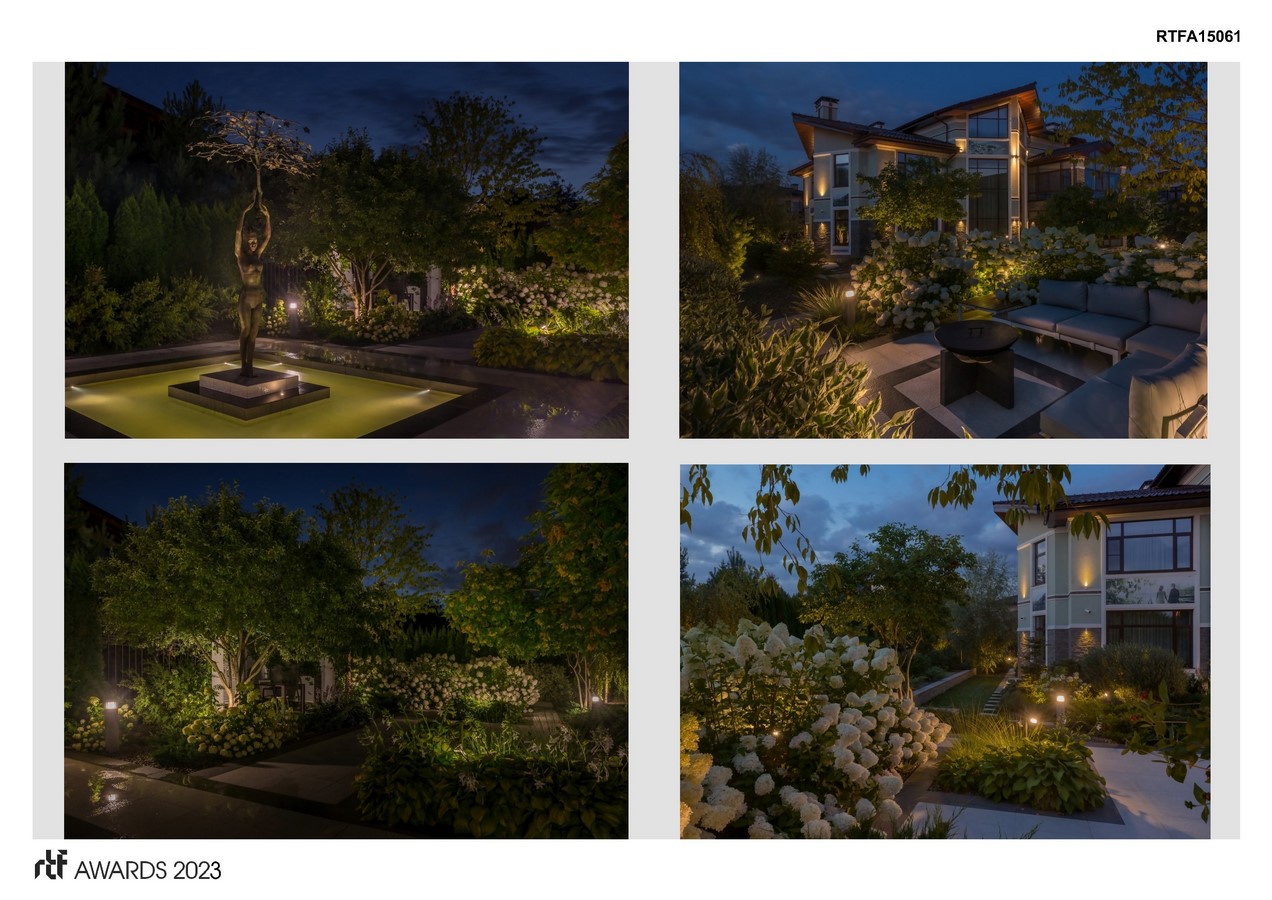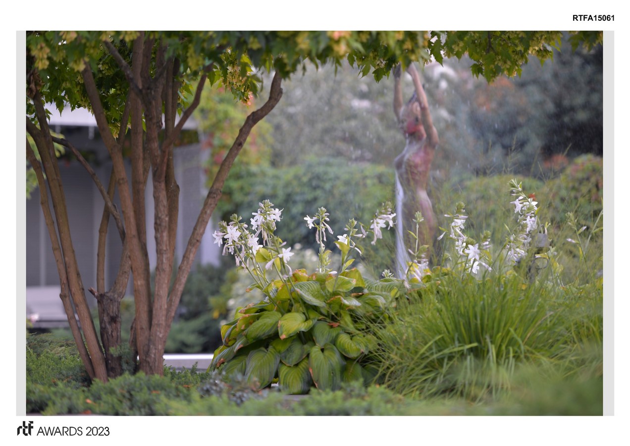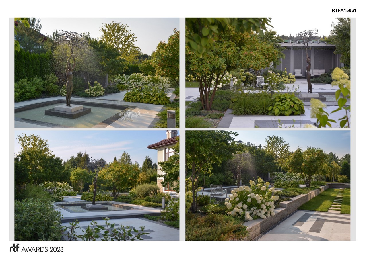 The architecture of the garden is made in a modern style, with square and rectangular zones. But the garden turned out to be cozy, because about 100 different types of plants give it volume, softening the pressure of straight lines. The key object in the garden is a unique fountain – a bronze sculpture of the Gaia, in the form of a beautiful dryad, who holds twigs with leaves on which water drops into a bowl.