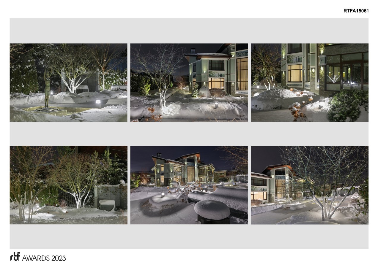 The paving uses dark and light gray porcelain stoneware. The retaining walls and the basement of the house are made of light granite and green quartzite. The porch of the house and the steps are made of green granite. Granite lamps are used to illuminate the paths. The gazebo and study are made of larch, painted in gray.
