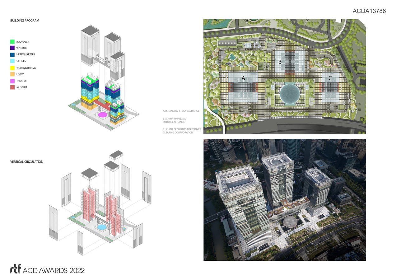 The project was designed for the Shanghai Stock Exchange (SSE), the China Financial Futures Exchange (CFFEX), and the China Securities Depository and Clearing Corporation (CSDCC). The underlying attitude and challenge in the design of the Shanghai International Financial Center was to design a powerful, unified complex of memorable images while addressing the three corporations’ individual needs and providing each with an appropriate individual identity.