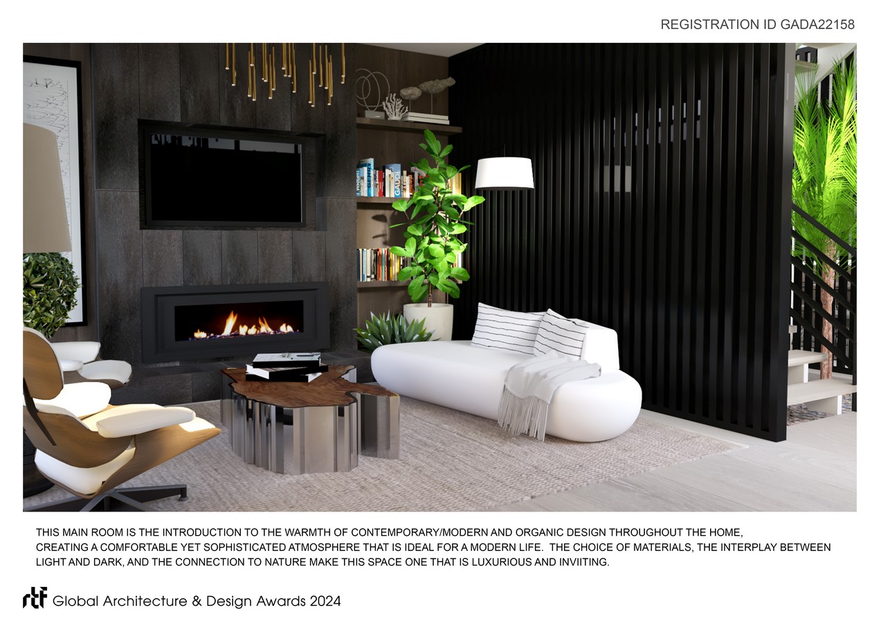 When you first enter the home, the main area embodies the elegance of contemporary design, with organic shapes, and dark textured walls flanking a fireplace that provide ambience and warmth. A sculptural live-edge like coffee table adds visual interest, while elements like potted plants bring nature into the home, and the carefully placed and selected contemporary and mid-century modern pieces create a cozy yet sophisticated atmosphere. Setting the tone for what is to come.