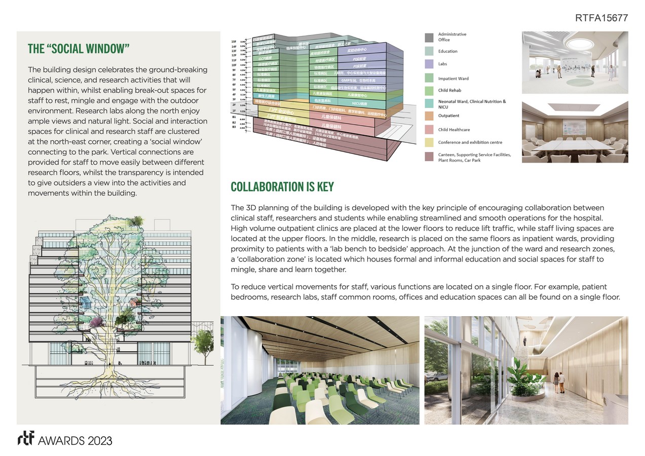 Vertical connections are streamlined and ensure smooth operations with a high-volume outpatient clinics placed at the lower floors to reduce lift traffic, while staff living spaces are located on the upper floors.