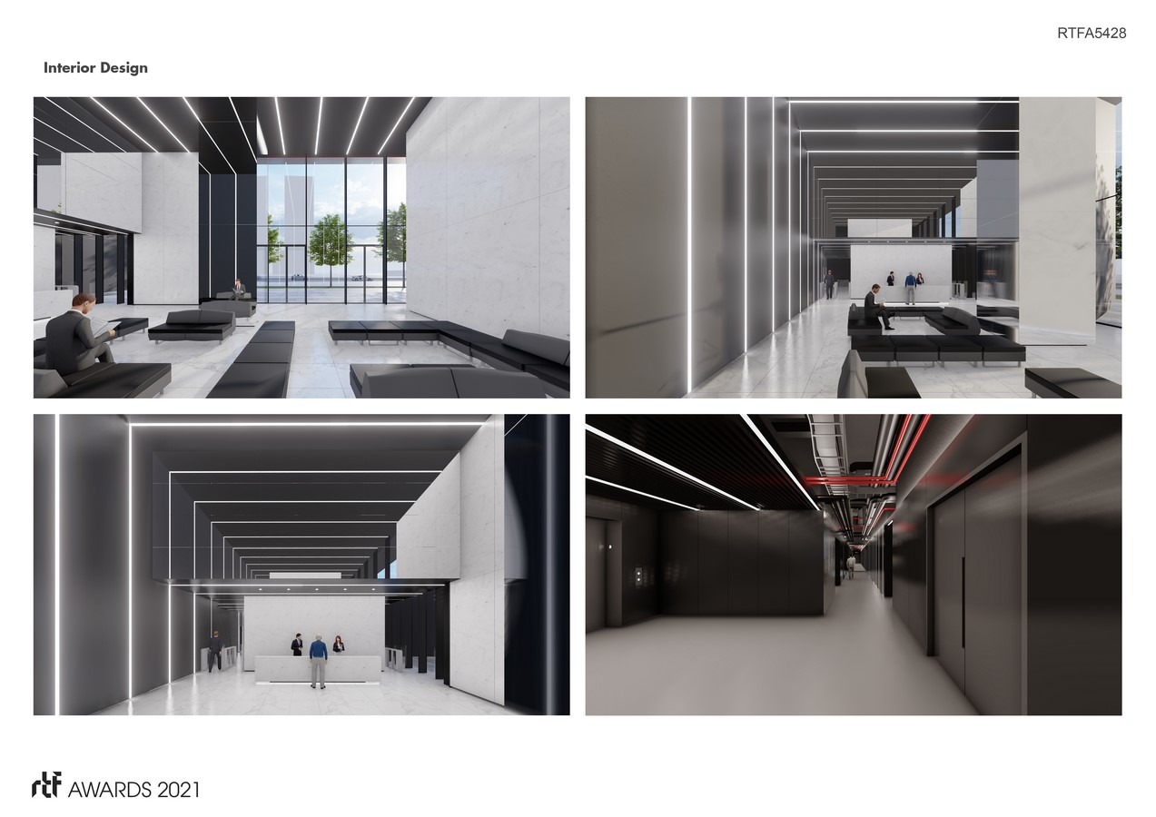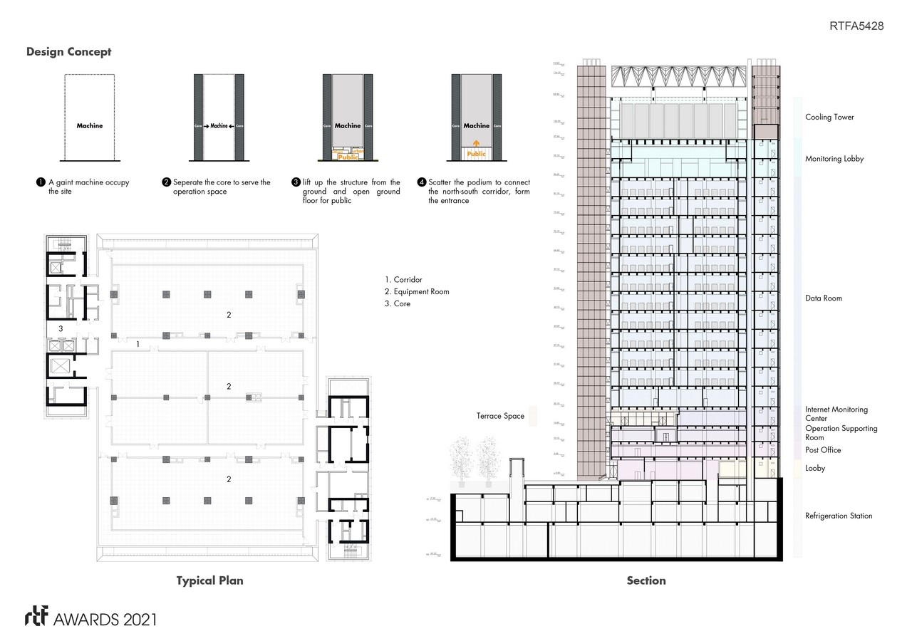 Such an infrastructure building would normally resemble a giant machine – a windowless block, that fails to relate to its urban surroundings. To compensate for this lack of interaction, the lower floors have been planned as an inviting, open lobby area, integrating a post office as well. Its presence ensures that the building will contribute to the public life of the city. The majority of stories are machine rooms, with up to 3515 data units. Controlling and monitoring units are located on the top floor. IT staff will be able to control all the data stream on this floor. Since the users of the building need to have a good working environment as well, our solution is to provide a huge terrace on the 16th floor, offering them both daylight and a view of the city and the bay area.