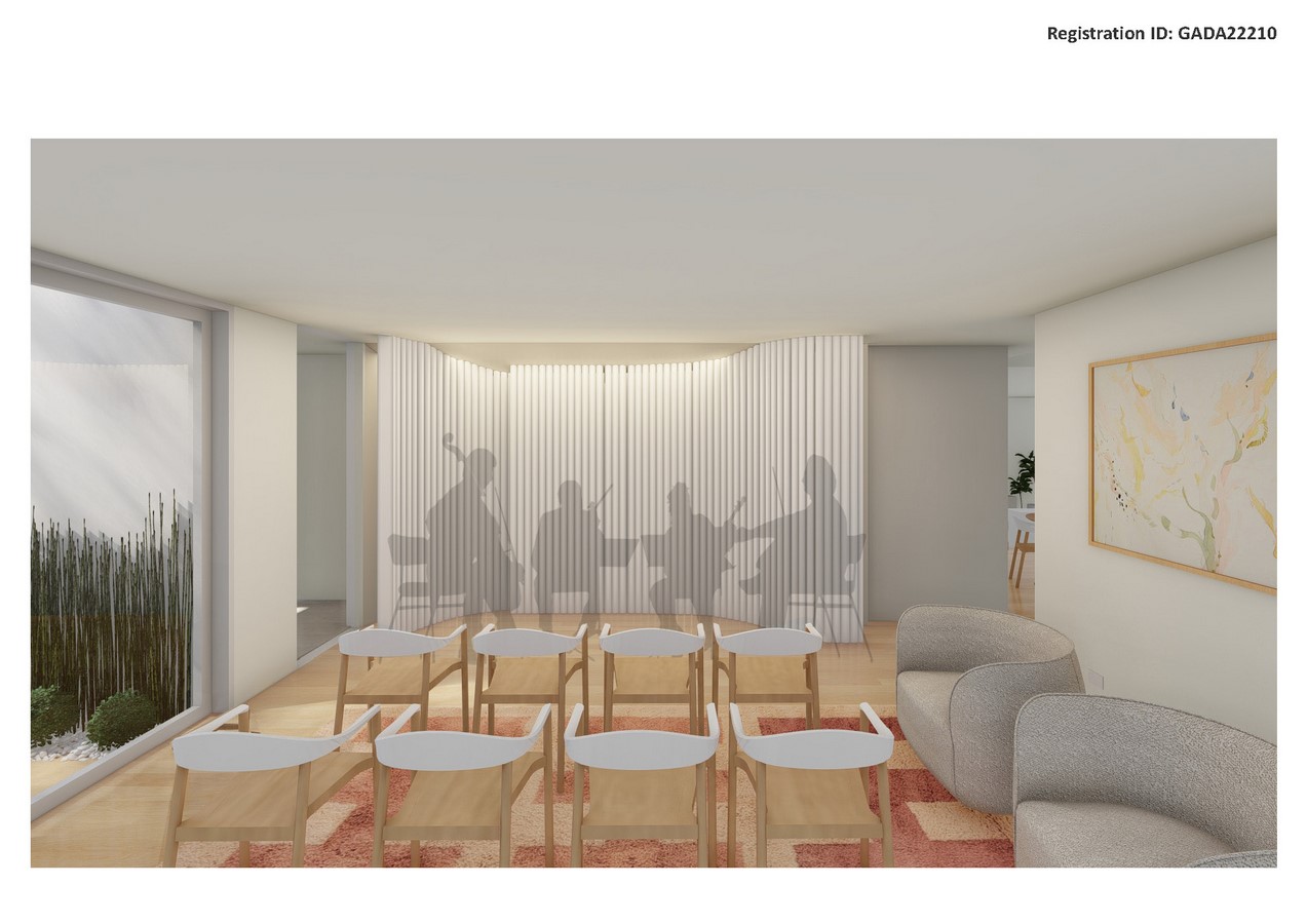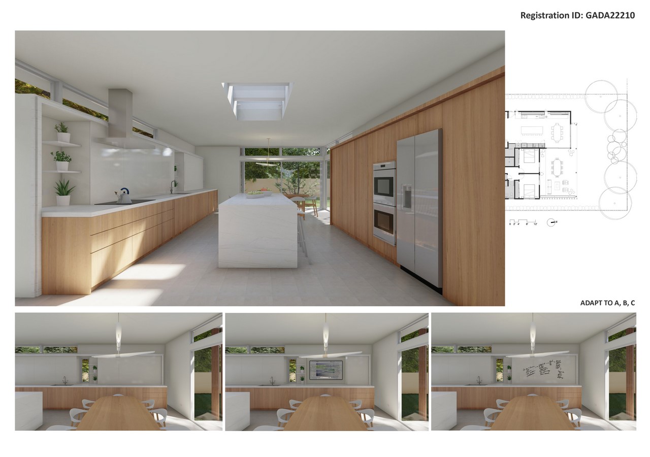 - Beyond addressing physical functional needs, Biophilic Design strategies were incorporated for emotional wellbeing benefits, such as for calming and restoration. Strategic openings provide direct indoor/outdoor connections to private gardens by Living Room and by Kitchen/Dining Room. Skylight above the Coffee Area provides a view of the sky from deep within the home.