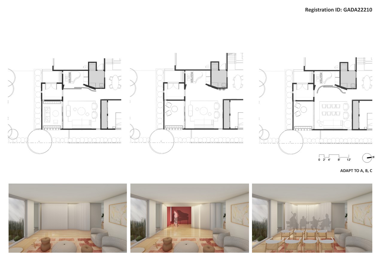 - Versatility is built into communal areas, so the family can adapt the spaces as needed, be it for a game of chess or enjoying a meal together as a family or hosting a brainstorm session for the office. By incorporating an accordion wall which serves to enclose a private practice alcove, it also provides acoustical absorption and can transform the space to define a stage for the musical family.