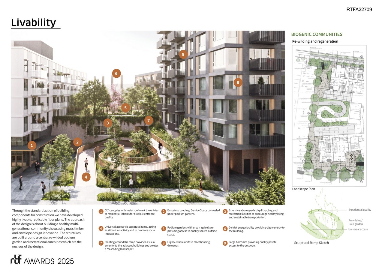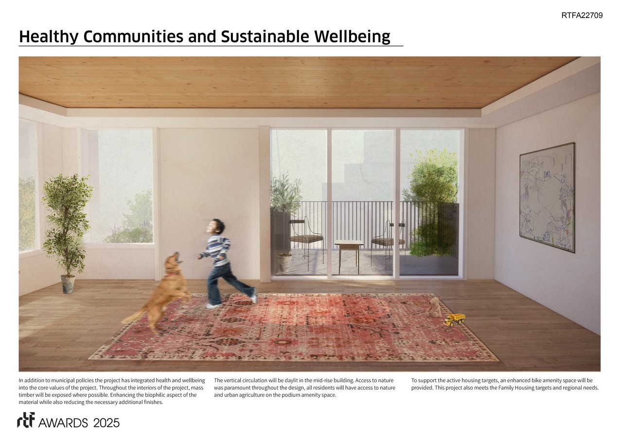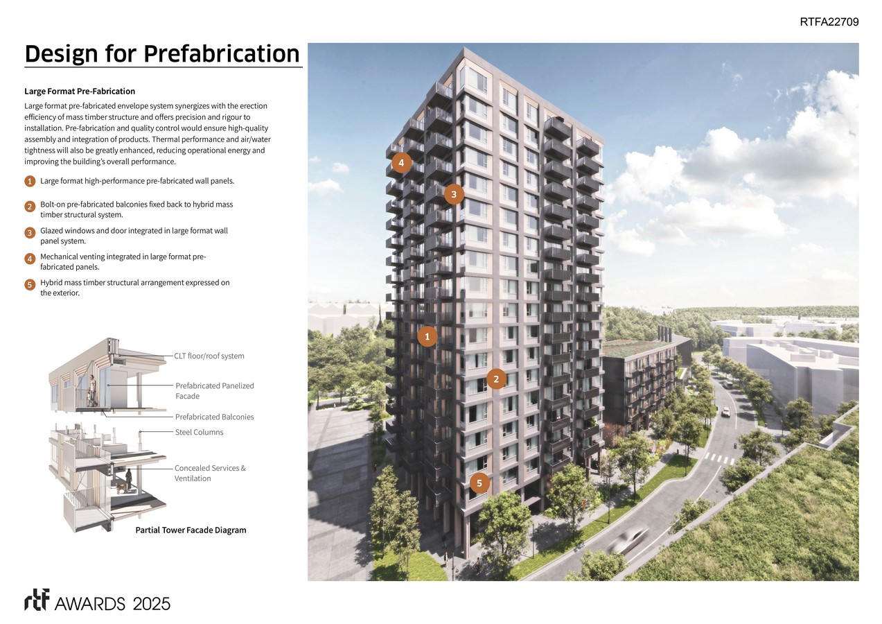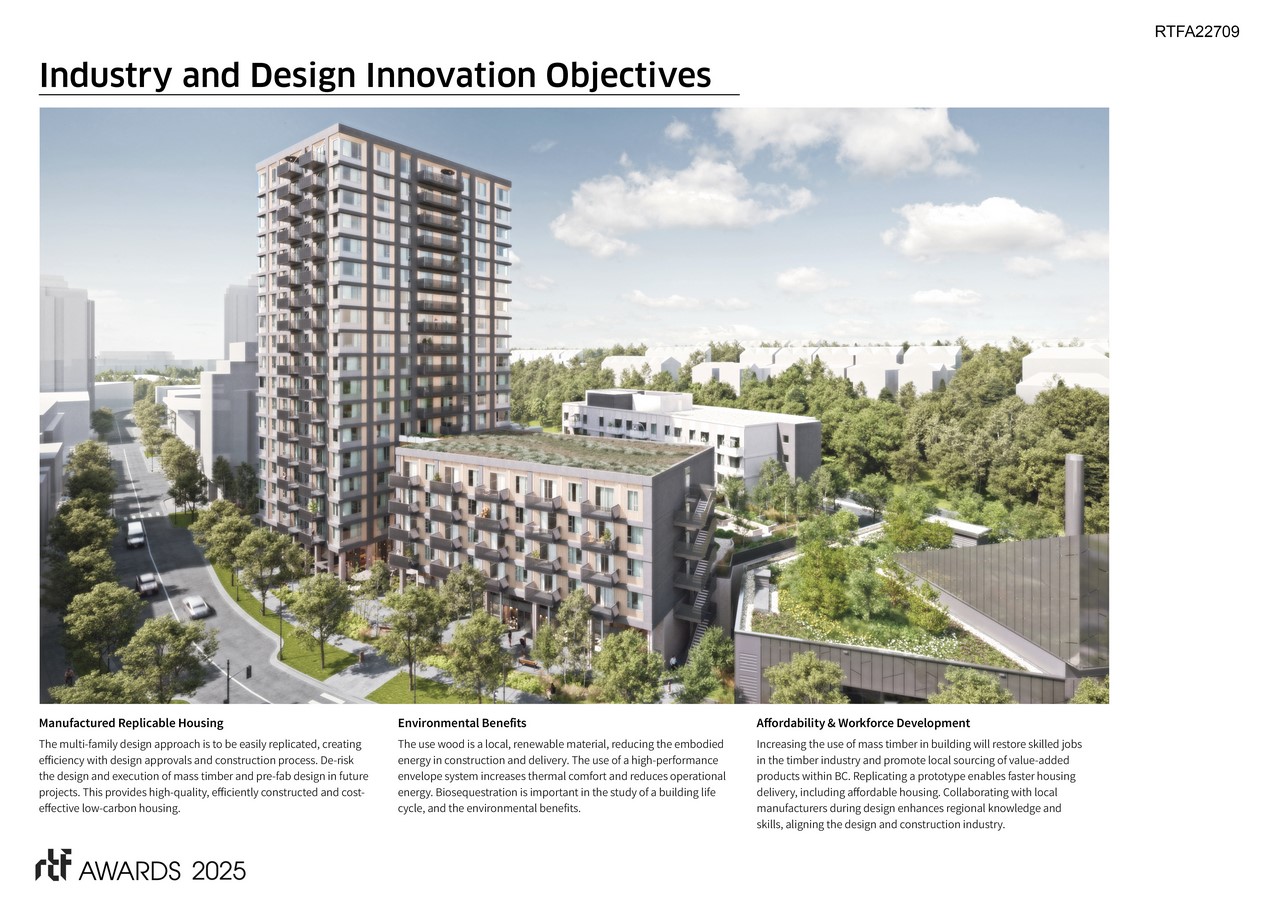 The development utilizes locally-sourced standardized mass timber components and prefabricated façade systems to address climate challenges and housing needs. It also aims to extensively develop the labor and workforce while creating a sustainably conscious housing community centered on health and wellbeing. Life-cycle analysis and mock-up performance testing have been integral to the project from the outset and will continue to demonstrate the impact of project decisions and share insights with a broader audience. The success of this project will validate the business case in a practical setting, showcasing best practices and sharing lessons learned to regularize mass timber construction in tall wood settings.