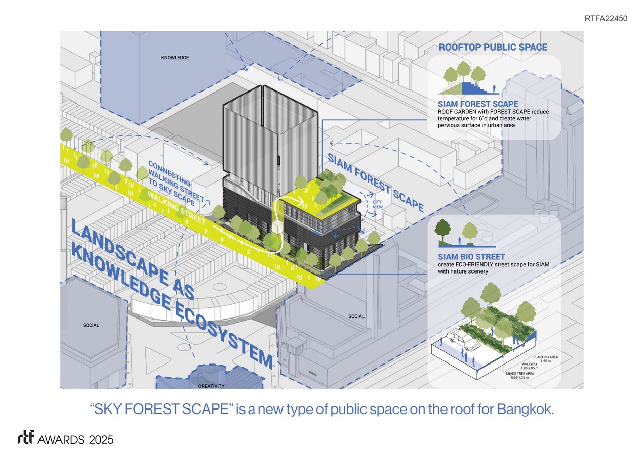 “SKY FOREST SCAPE” is a new type of public space on the roof for Bangkok. It is a part of the new mixed use development called “SIAMSCAPE” which is located at the heart of ‘Siam Square’ – a vibrant young-gen commercial district.