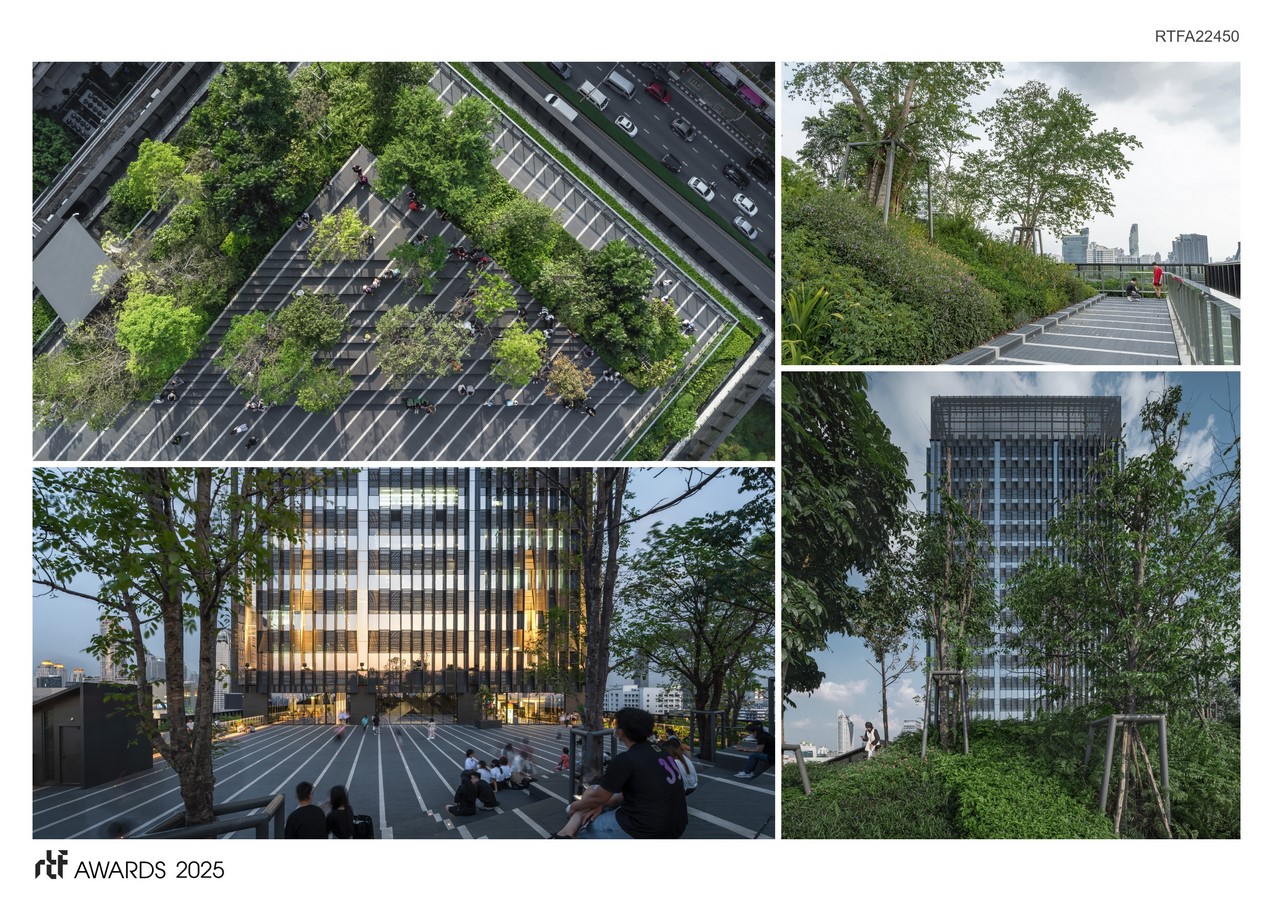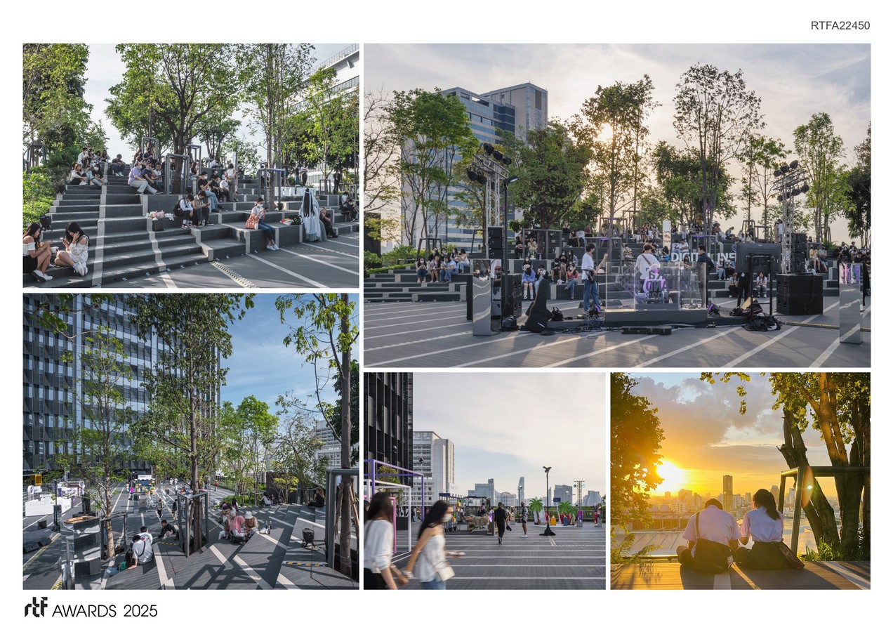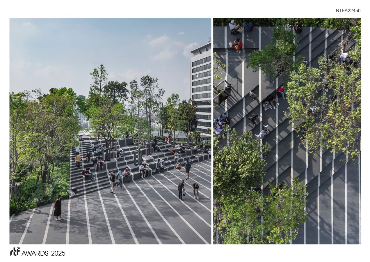This rooftop sanctuary redefines public spaces by lifting a corner to form a grand amphitheater, ingeniously designed to accommodate deep soil beds nurturing a grove of forest trees. This lush greenery not only provides a cooling respite but also serves as a multifunctional gathering hub tailored to Bangkok’s tropical climate. Strong linear lines from the architecture facade continue to landscape pavement to create a holistic space, creating a cohesive and inviting environment.