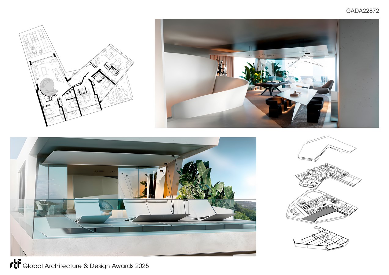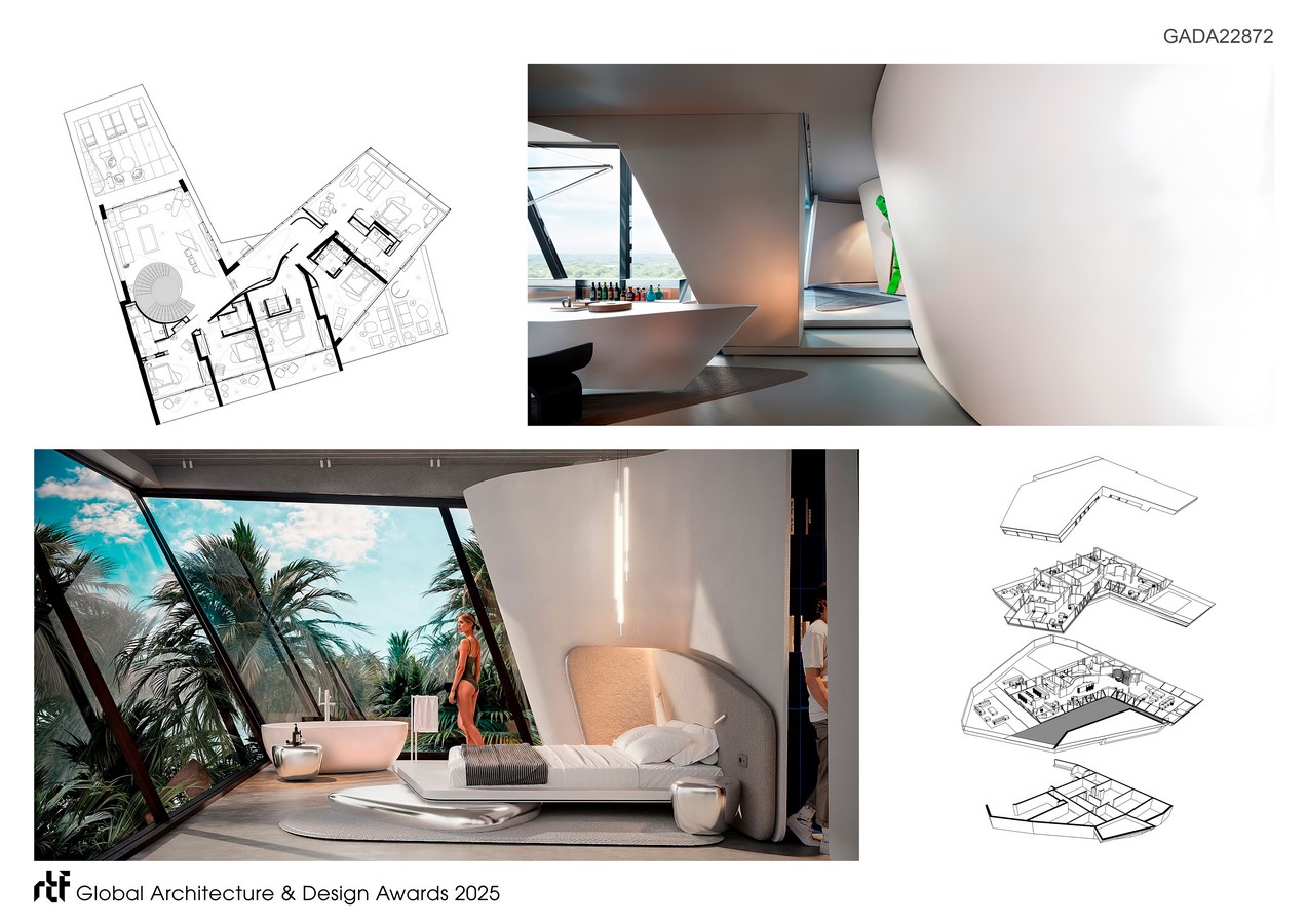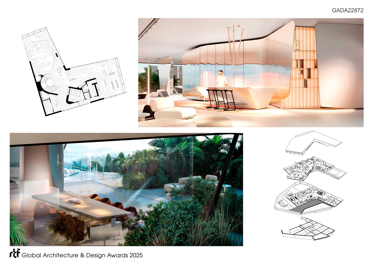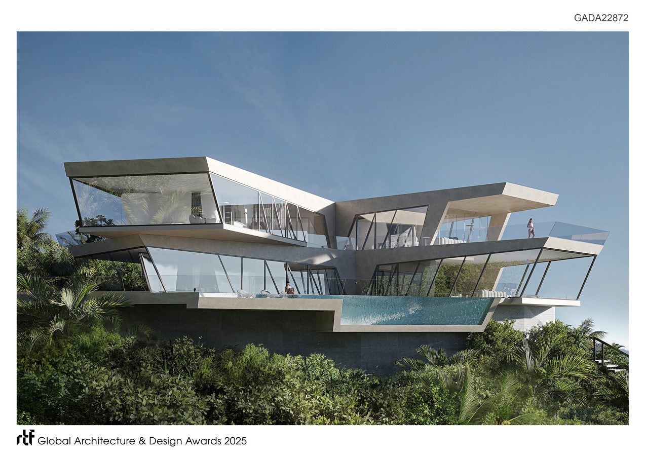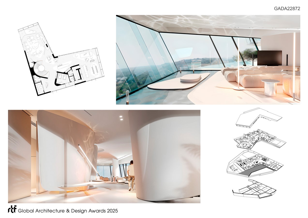 The villa is spread across three levels. The ground floor is a communal open space: living room, show kitchen, bar, and lounge — all enclosed in a glass amphitheater with no columns, merging with the ocean and sky. The second floor offers five bedrooms with private terraces, including a master suite with a semi-open terrace that blurs the line between built form and flight. The third level is carved into the rock and houses the gym, cinema, and service rooms.