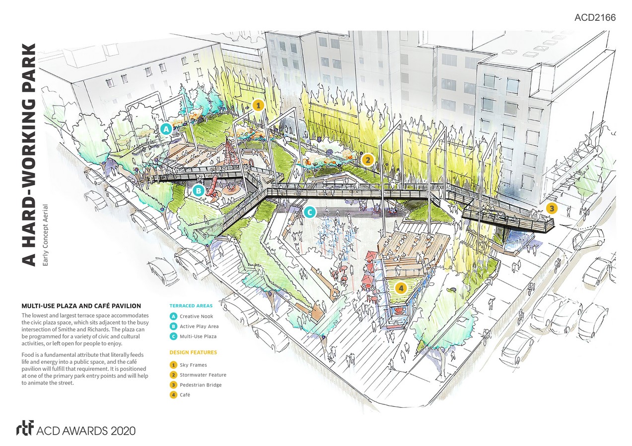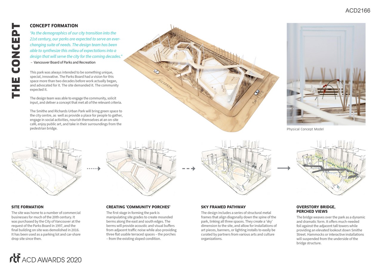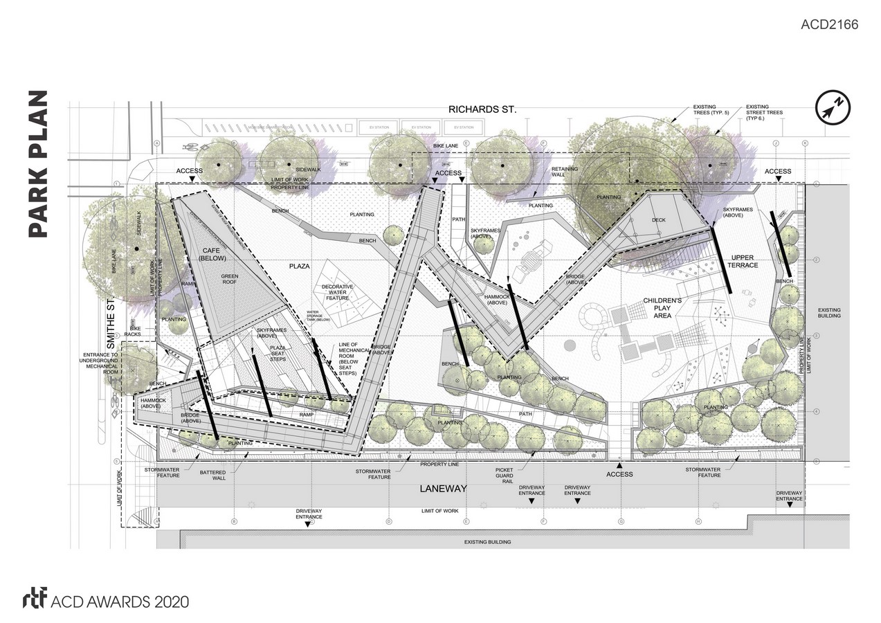 The Smithe and Richards Urban Park is the Vancouver Board of Parks and Recreation’s gift to the downtown core —a vibrant, dynamic, and inclusive space in the heart of the city. This new park has been consciously created to meld the downtown office environment with urban dwelling. The design is iconic, memorable and impactful: magnetic multi-layered, effectively programmed ‘community porches’ that will serve the needs of more than 30,000 people who live and work within a five-minute walk of the space.
