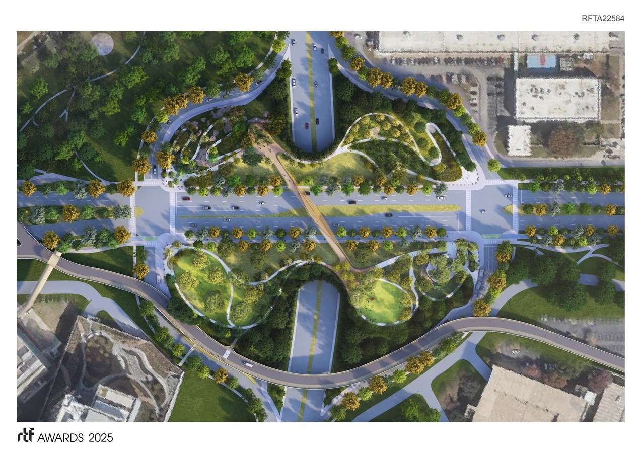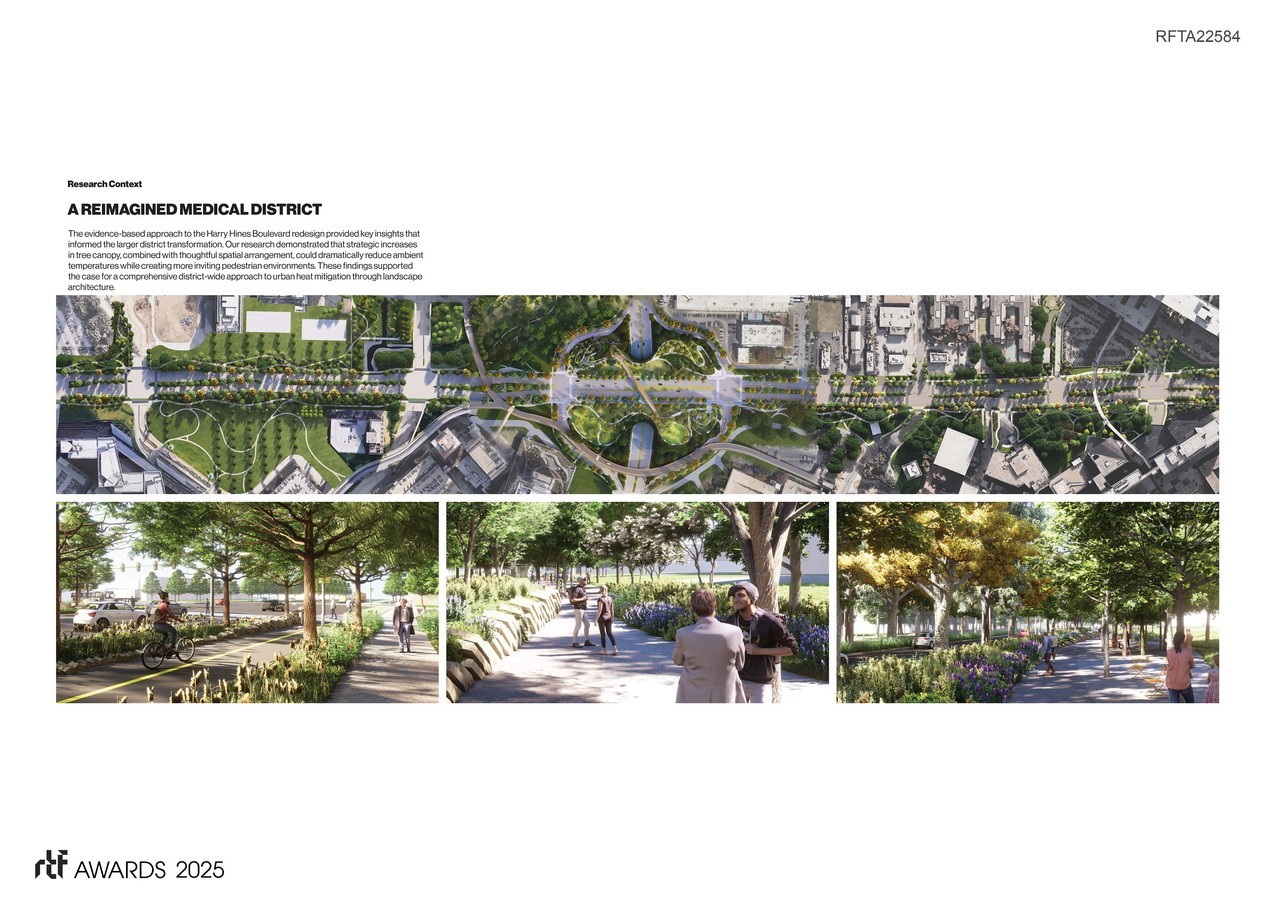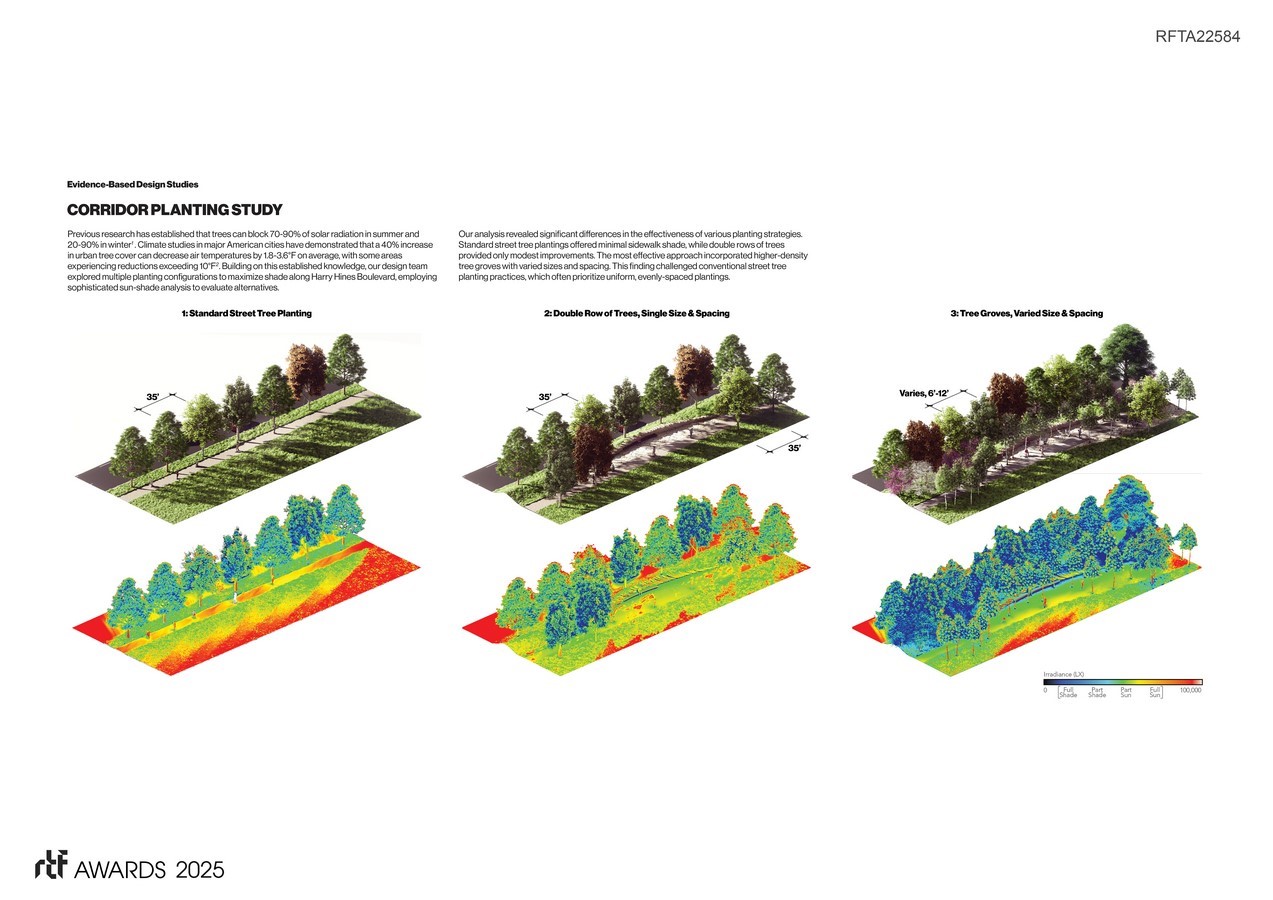 Our research explored whether evidence-based design could improve thermal comfort and reduce temperatures in this healthcare hub. The team focused on transforming two key spaces: a 2-mile stretch of Harry Hines Boulevard (the “Green Spine”) and an 8-acre cloverleaf interchange (the “Green Heart”).