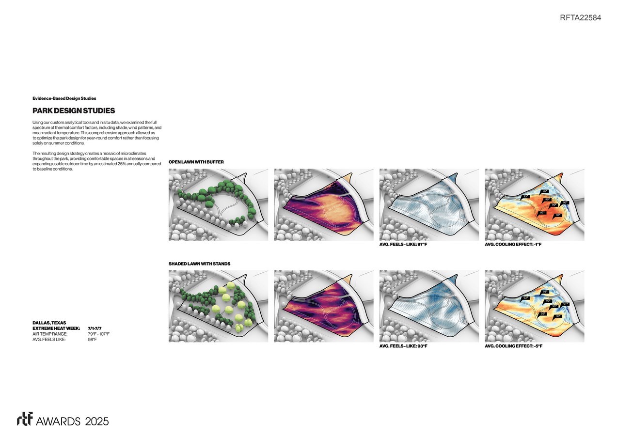 This project demonstrates how landscape architecture can address critical urban environmental challenges through evidence-based design. By combining rigorous scientific methods with creative design thinking, we developed strategies to significantly improve thermal comfort in one of Dallas’ hottest districts.