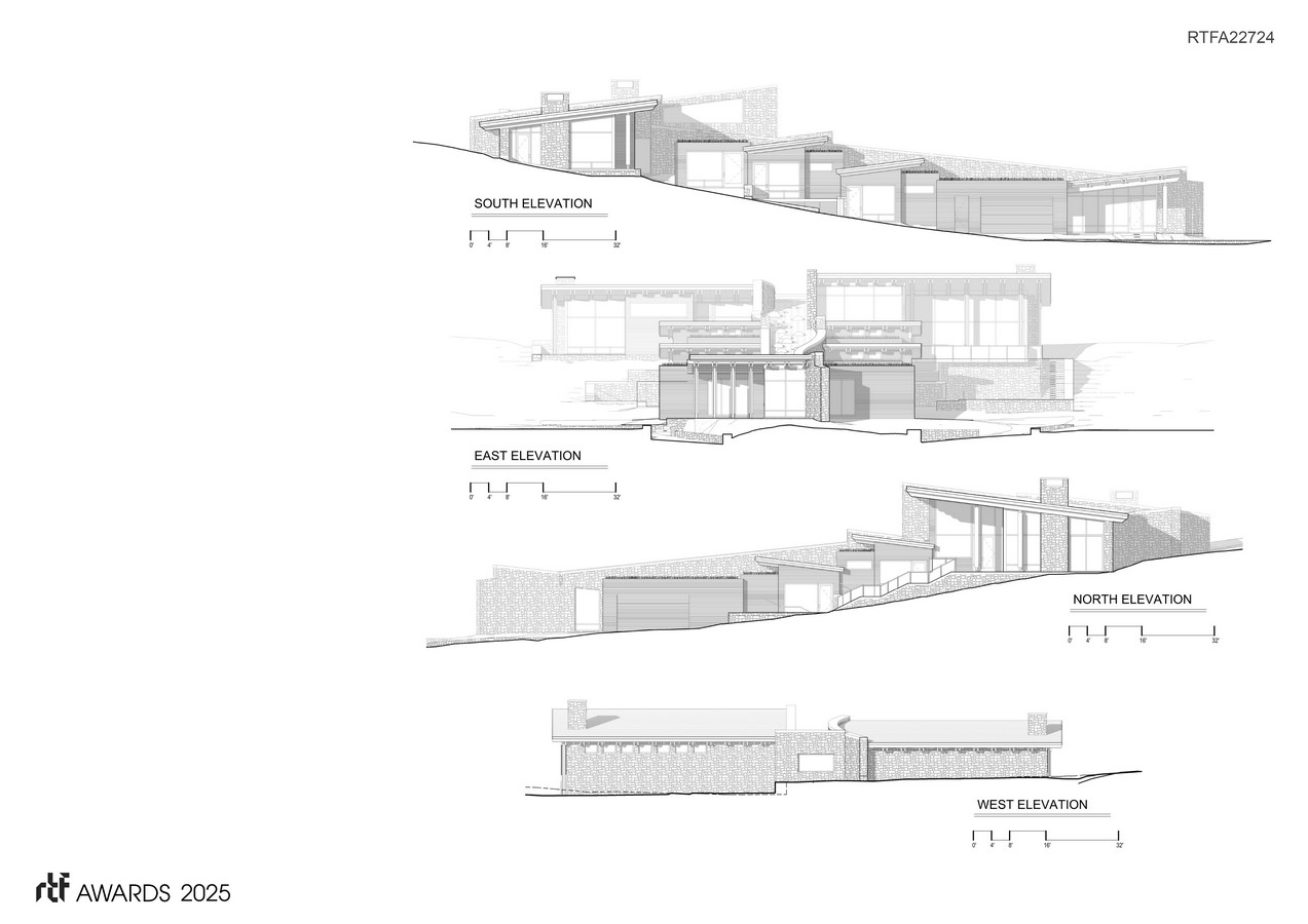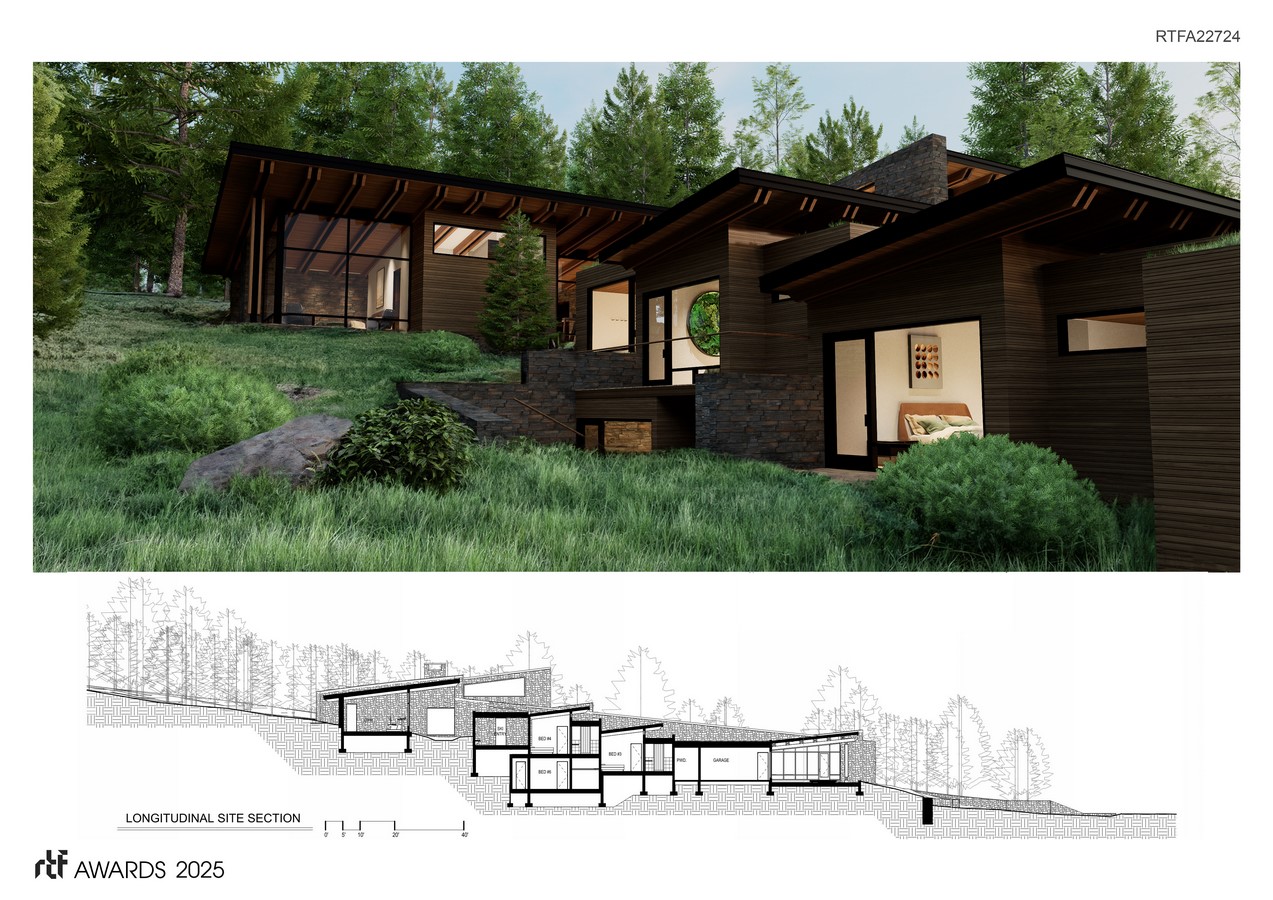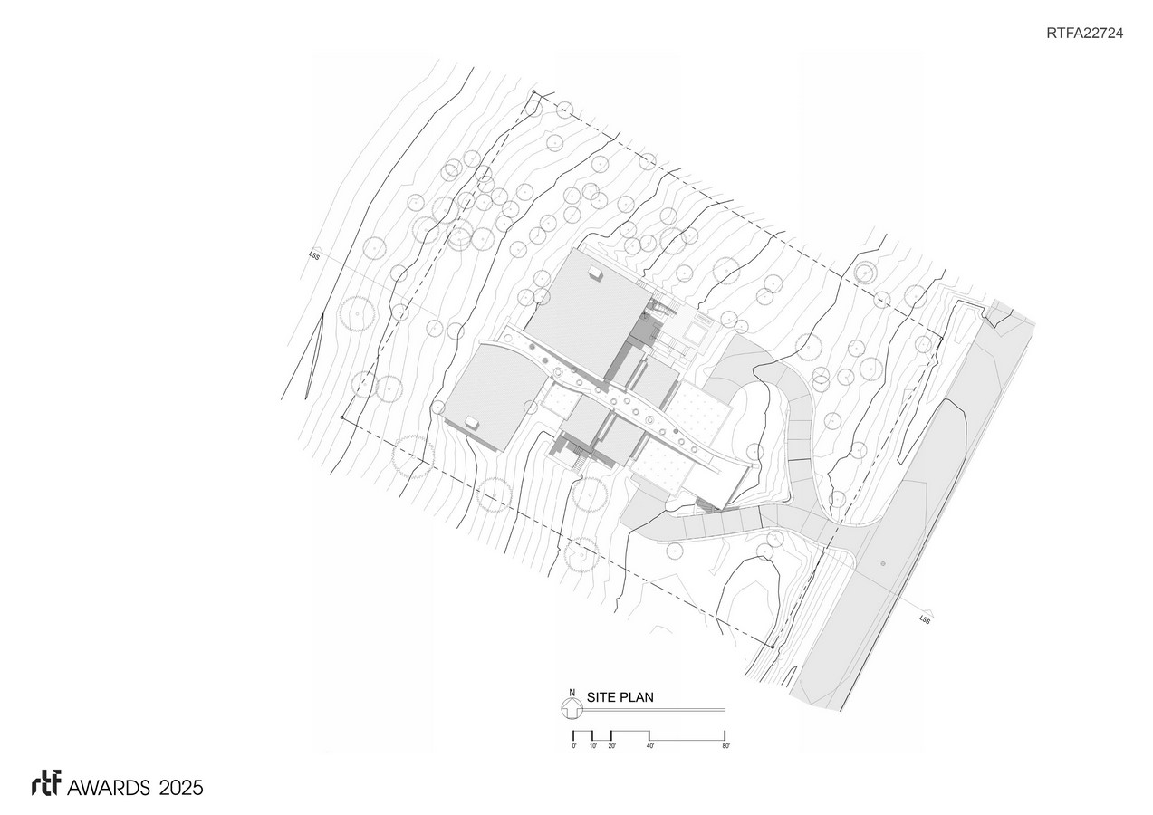 The entrance level begins at the lower portion of the site, guiding your gaze upwards, gradually unveiling the final highest space, the master suite, nestled amidst the upper topography.