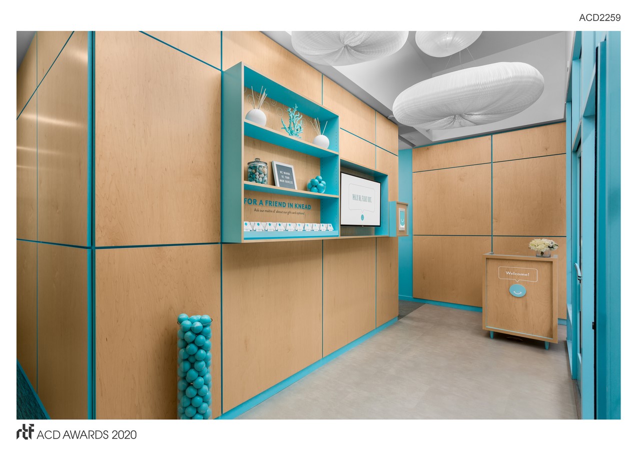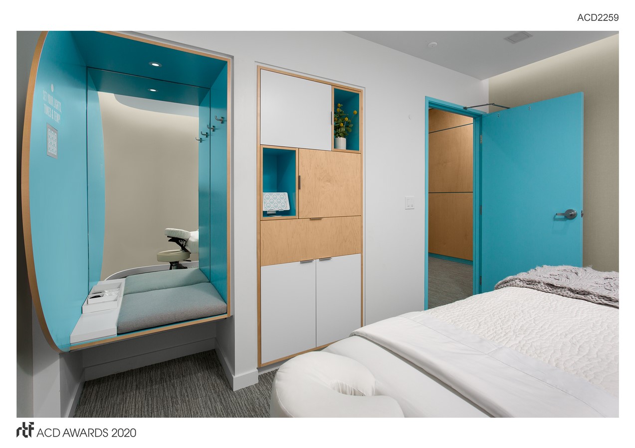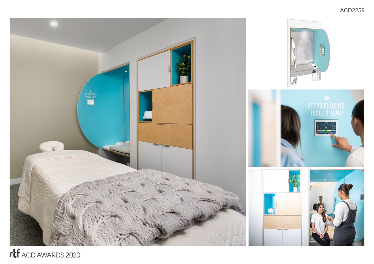 The experiential journey of Squeeze is imagined as a gradual transition from the hustle and bustle of the outside world to the privacy and serenity of the individualized treatment rooms. After being greeted at reception, customers move to a protected, interior relaxation lounge where they can enjoy tea or water and sample aromatherapy options. Once inside the treatment room, guests will find their own dedicated space to comfortably change, conveniently store their belongings, and easily customize their environment with touch screen control of light, temperature and music. The guest station is stocked with everything needed to help support the experience within easy reach – including mints, cough drops, hair ties and phone charging – as well as a large personal mirror for checking in before emerging back into outside world.