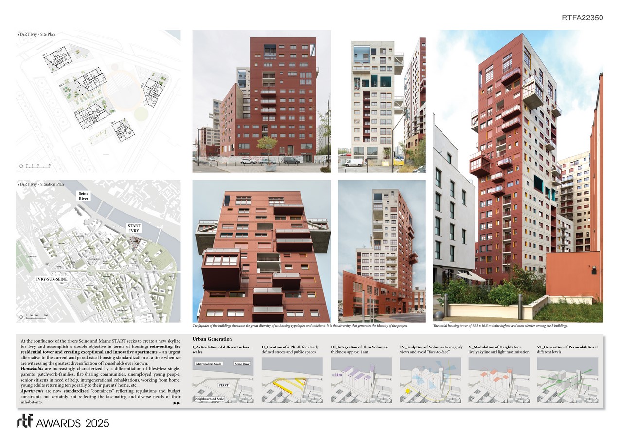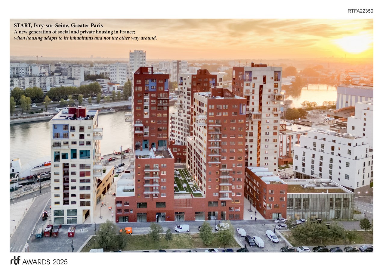 At the confluence of the rivers Seine and Marne START seeks to create a new skyline for Ivry and accomplish a double objective in terms of housing: reinventing the residential tower and creating exceptional and innovative apartments – an urgent alternative to the current and paradoxical housing standardization at a time when we are witnessing the greatest diversification of households ever known.