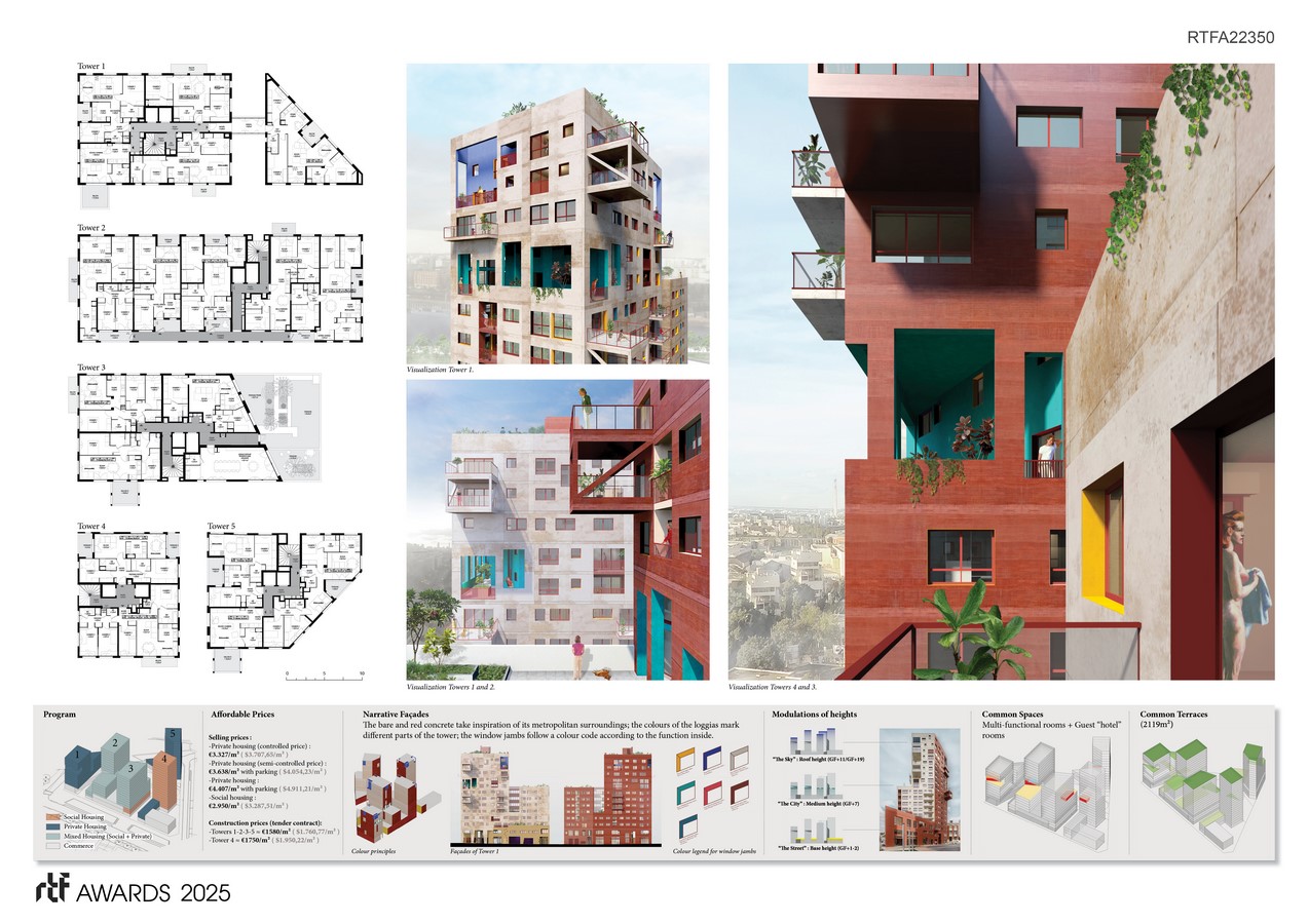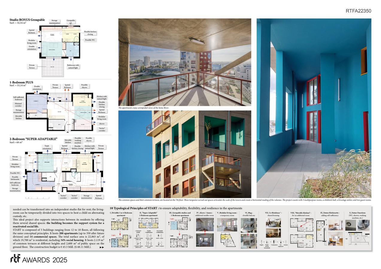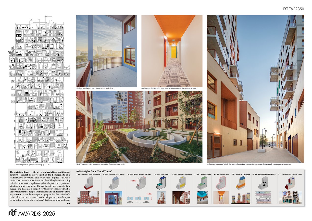 START is composed of 5 buildings ranging from 12 to 18 floors, all following the same conceptual principles. It hosts 288 apartments (up to 350 after future division) and 14 commercial spaces. The total surface area is 22,863 m², of which 19,700 m² is residential, including 34% social housing. It hosts 2.119 m² of common terraces at different heights and 2,600 m² of public space on the ground floor. The construction budget is € 43.3 Mill. ($ 48.11 Mill.).
