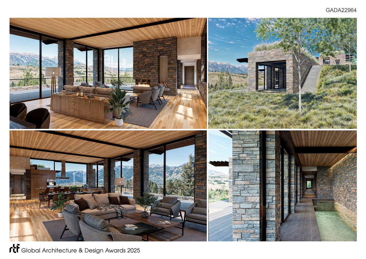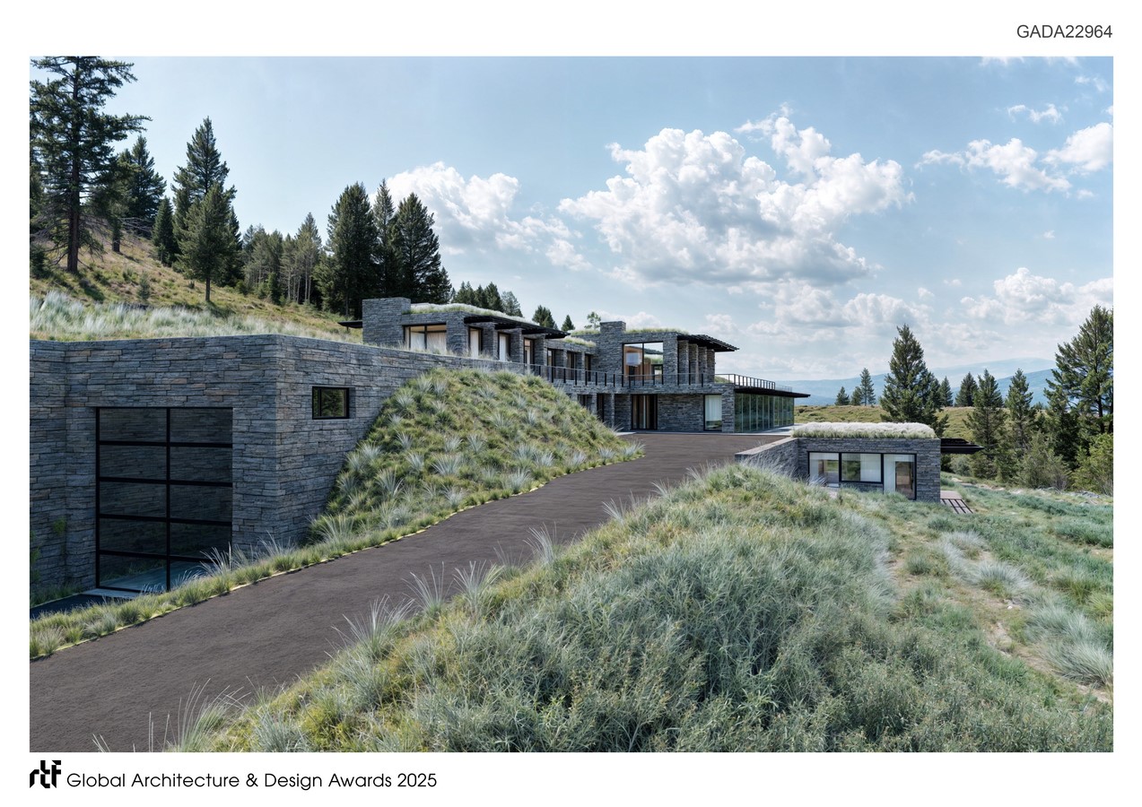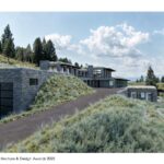 Buried into a hillside near the top of a butte overlooking the Snake River and valley floor in Jackson Hole, Wyoming, this residential compound of stone walls, stone floors, and sod roofs blends discreetly into its surroundings, satisfying strict Teton County development requirements for harmoniously integrating with nature.