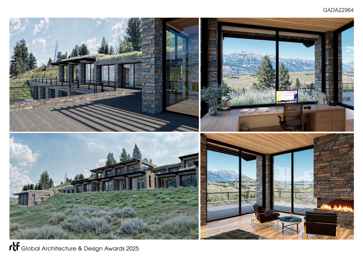 Buried into a hillside near the top of a butte overlooking the Snake River and valley floor in Jackson Hole, Wyoming, this residential compound of stone walls, stone floors, and sod roofs blends discreetly into its surroundings, satisfying strict Teton County development requirements for harmoniously integrating with nature.