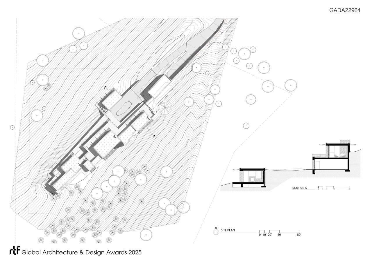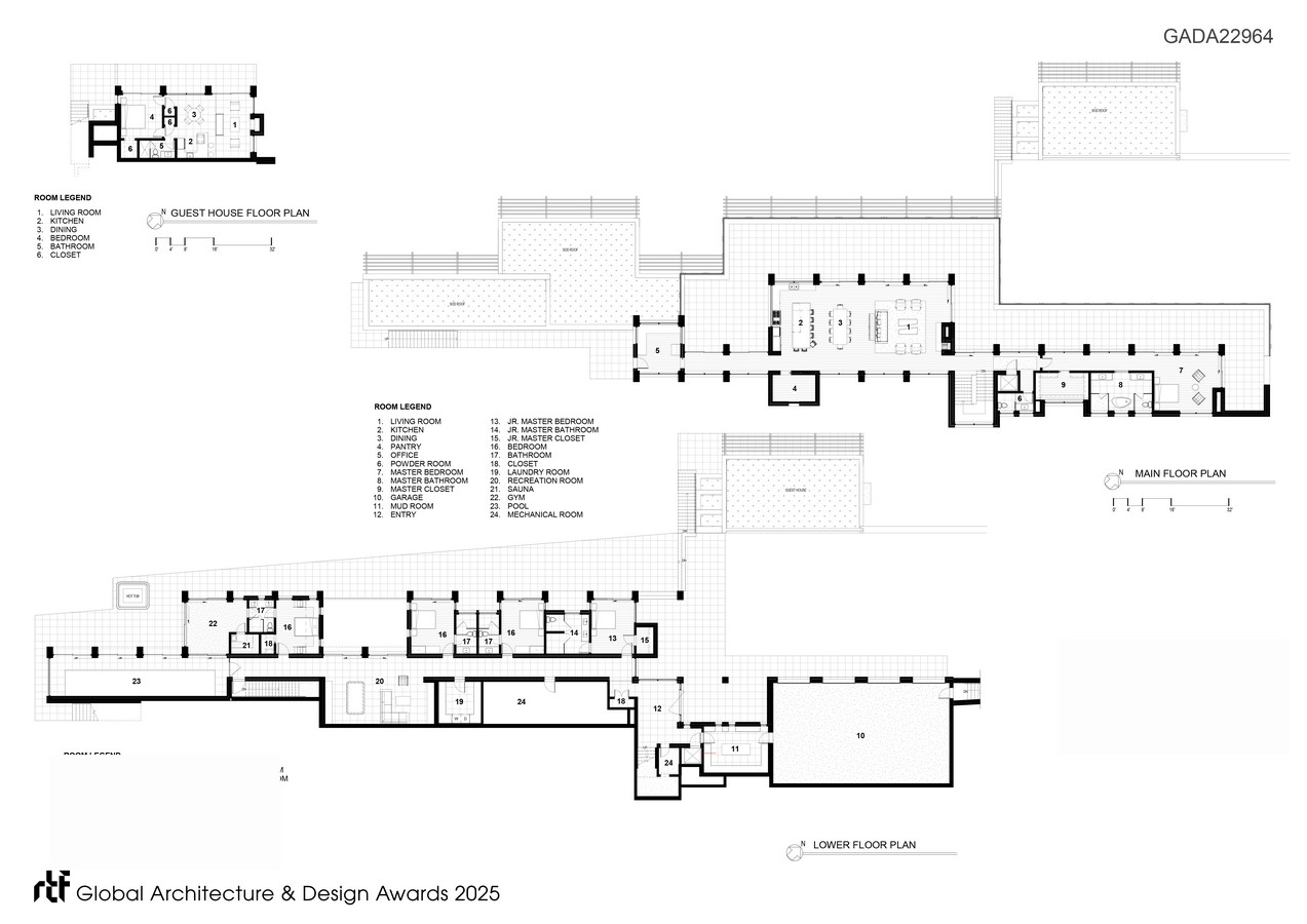 Each floor level is directly connected to the changing grade as the house terraces down the slope, giving the occupants easy access to the site by way of outdoor terraces that are complemented by adjacent sod roofs. The main house’s upper floor provides dedicated private space for the owner while the lower floor is primarily for children and guests. The separate guesthouse is set at an even lower level than the main house, let into the hillside for maximum privacy and minimal visibility from above. The main house looks over the top of the guesthouse’s sod roof with unobstructed views.