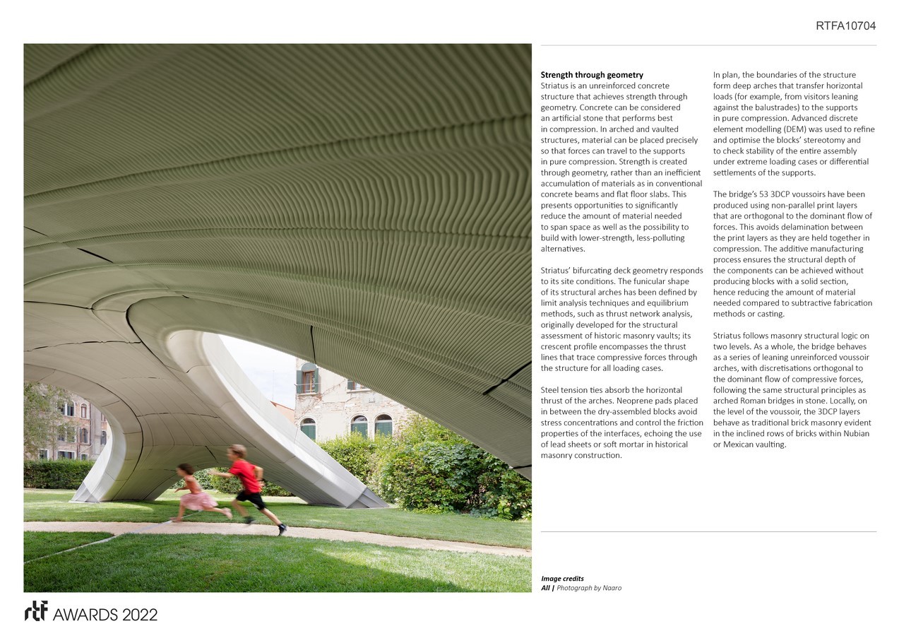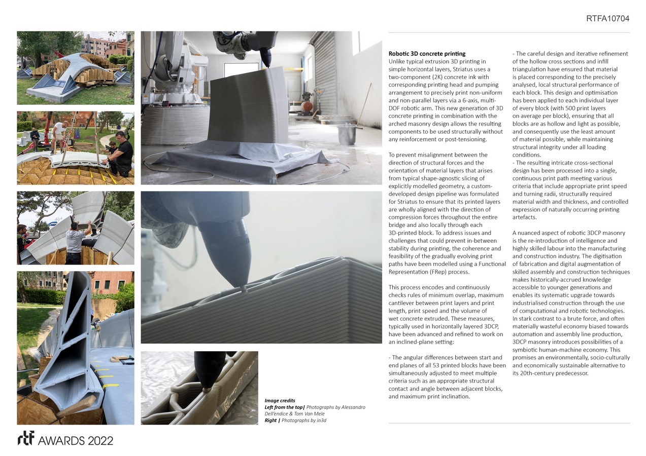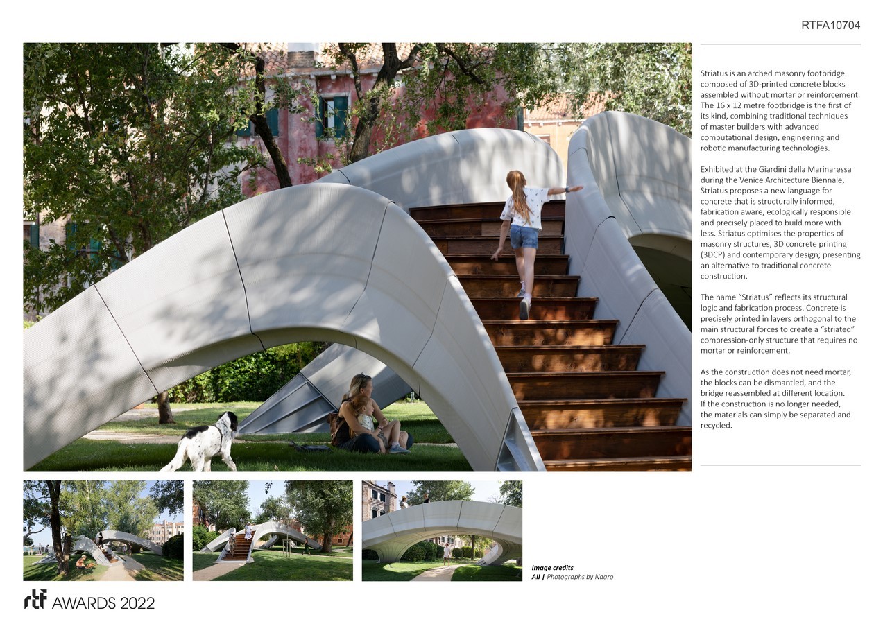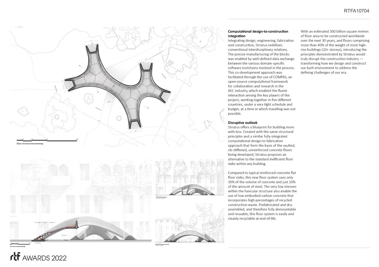 Striatus is an arched masonry footbridge composed of 3D-printed concrete blocks assembled without mortar or reinforcement. The 16 x 12 metre footbridge is the first of its kind, combining traditional techniques of master builders with advanced computational design, engineering and robotic manufacturing technologies.