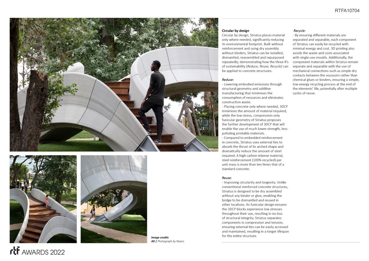 Exhibited at the Giardini della Marinaressa during the Venice Architecture Biennale, Striatus proposes a new language for concrete that is structurally informed, fabrication aware, ecologically responsible and precisely placed to build more with less. Striatus optimises the properties of masonry structures, 3D concrete printing (3DCP) and contemporary design; presenting an alternative to traditional concrete construction.