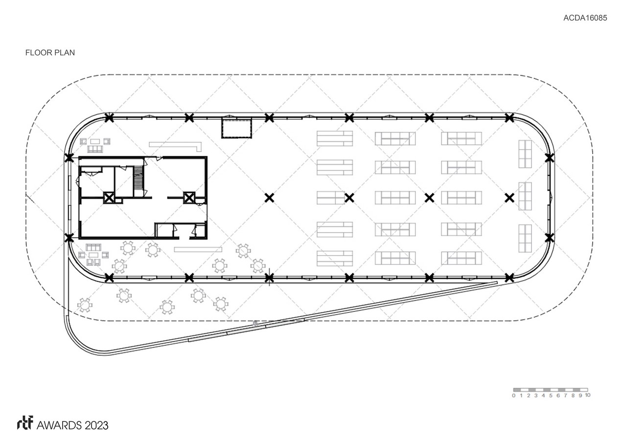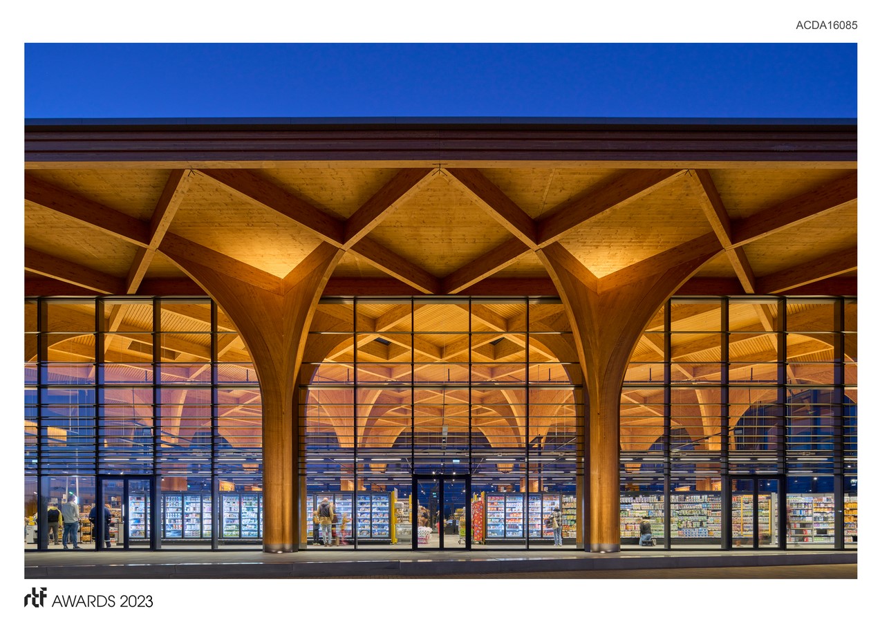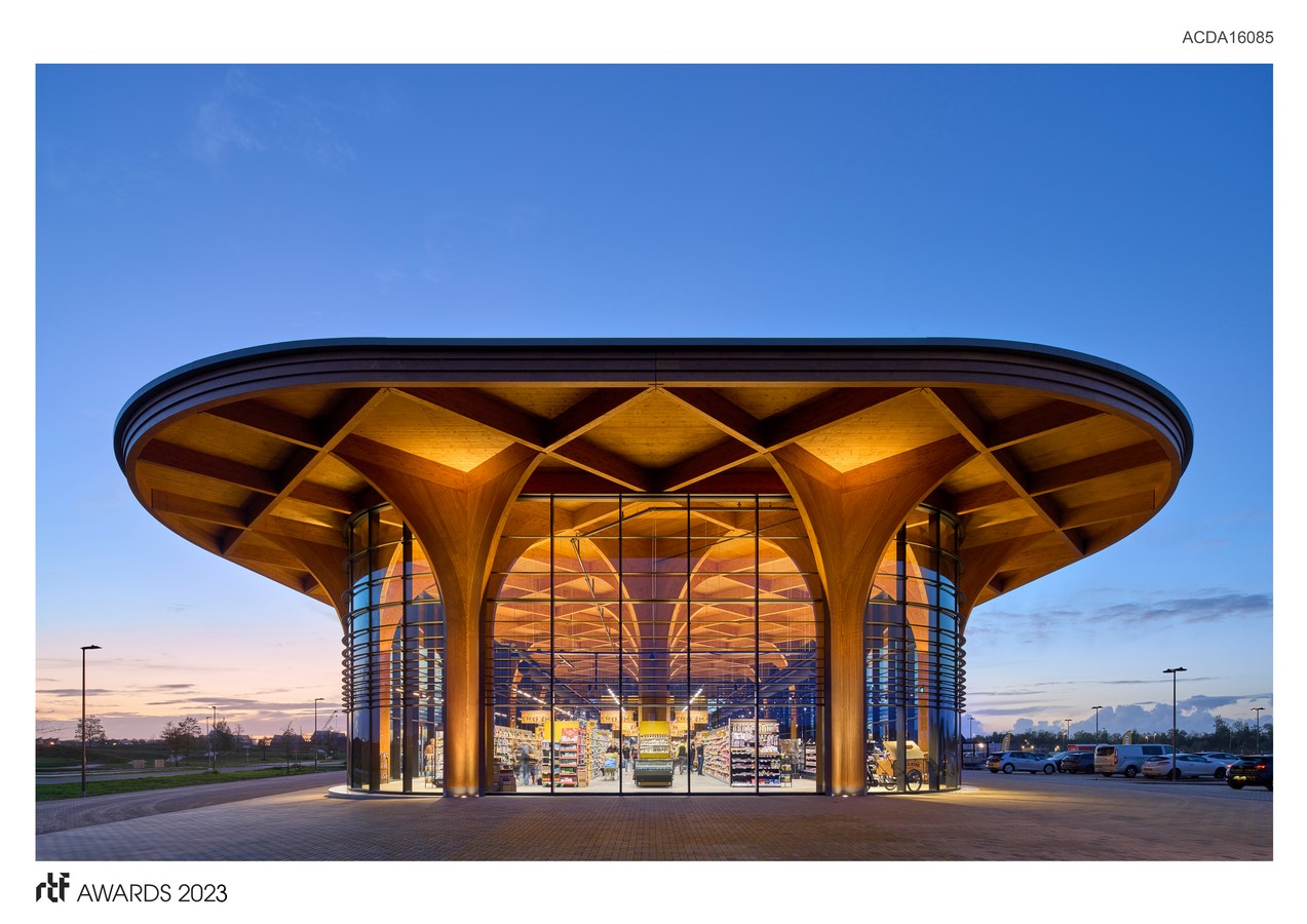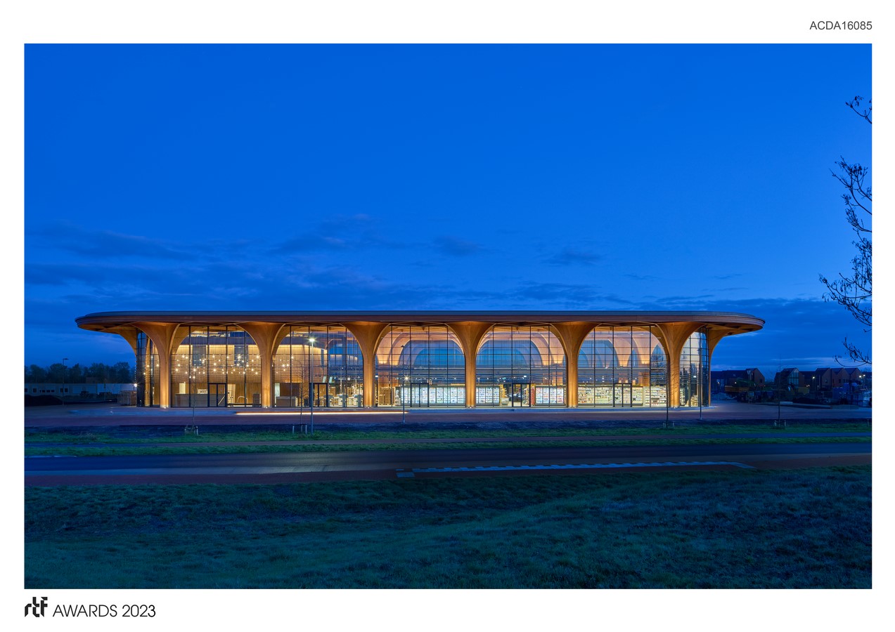 SuperHub represents a revitalised circular version of the traditional market hall design. It is expansive and transparent, with a supporting structure made entirely of cross-shaped laminated wooden columns and beams, which give the building a cathedral-like appearance. The large span and nine-metre ceiling height create an exceptionally luminous space and offer the opportunity for flexible layout and usage adaptations in the future. The large canopy provides sun protection and pulls the structure into its green surroundings with the use of elegant columns and net-like wooden trusses. Additionally, the cleverly designed cross forms provide the building with stability, so that no additional wind bracing infrastructure is required and it can withstand the vibrations of Groningen earthquakes. The wooden construction also ensures a positive climate impact, and the roof of SuperHub has been reserved for the placement of solar panels and plants for bees and insects. The built-in air treatment installation as well as the heat and cold ground storage ensure an optimal and energy-efficient indoor climate.