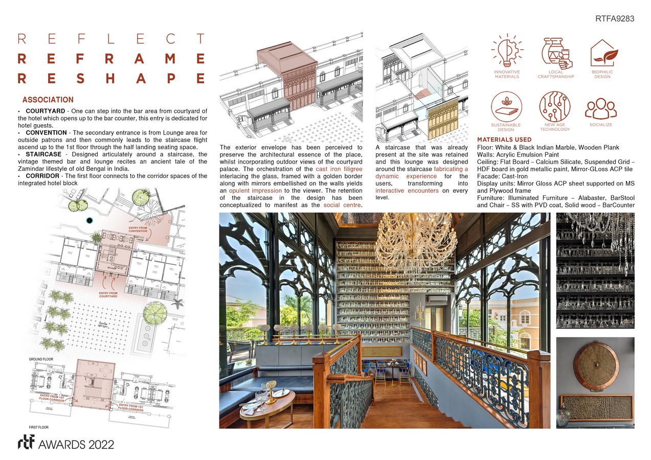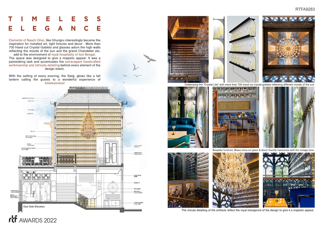 Elements of Naach Ghar, like Ghungru interestingly became the inspiration for installed art, light fixtures and decor. More than 700 Hand cut Crystal Goblets and glasses adorn the high walls reflecting the moods of the sun and the grand Chandelier etc. add to the environment of royal hospitality of lost Bengal. The minute detailing and precise fabrication of the crystals reflect the royal indulgence of the design to give it a majestic appeal. It was a painstaking task and accentuates the extravagant handcrafted workmanship and intricate detailing behind every element of the design intent.