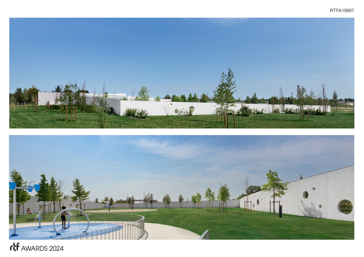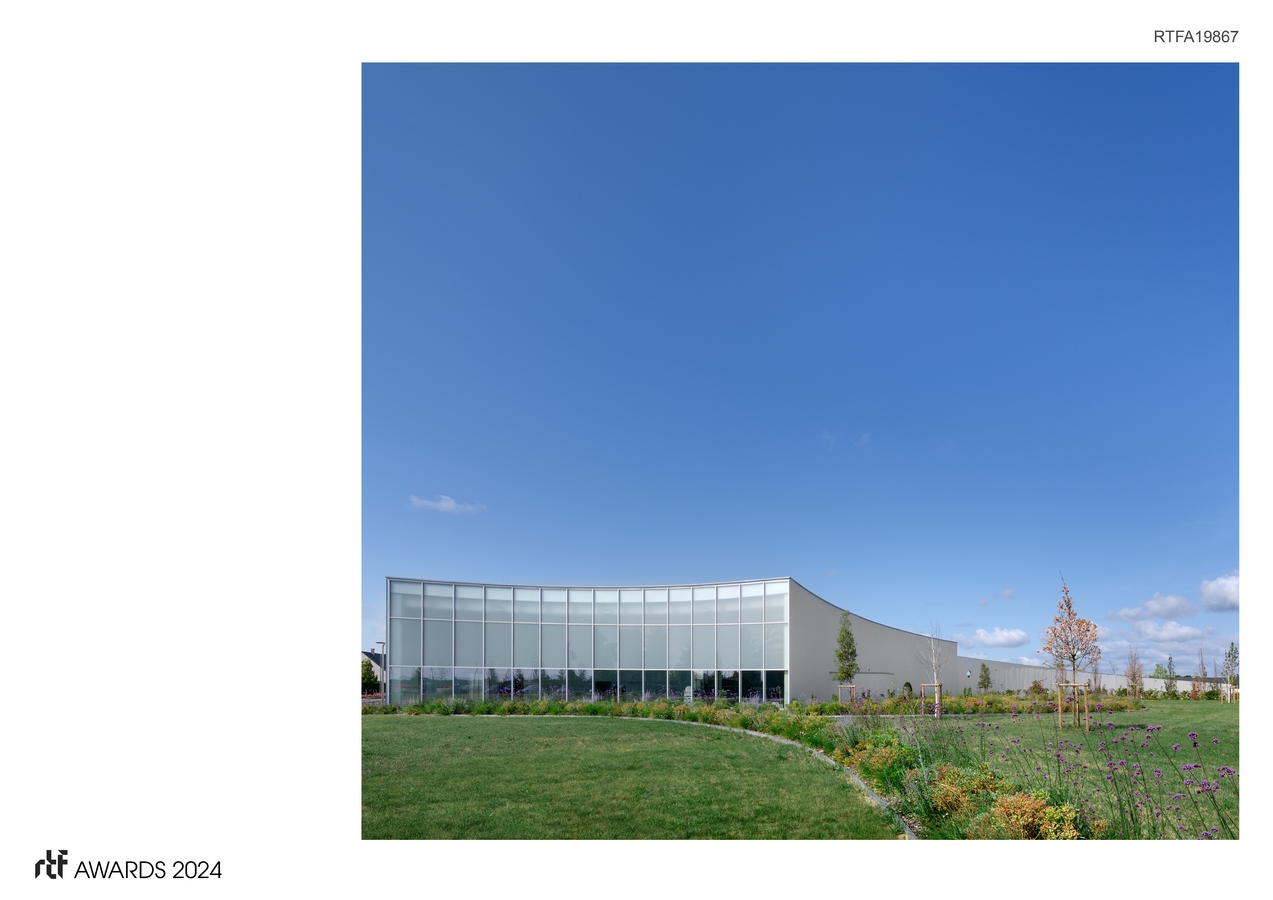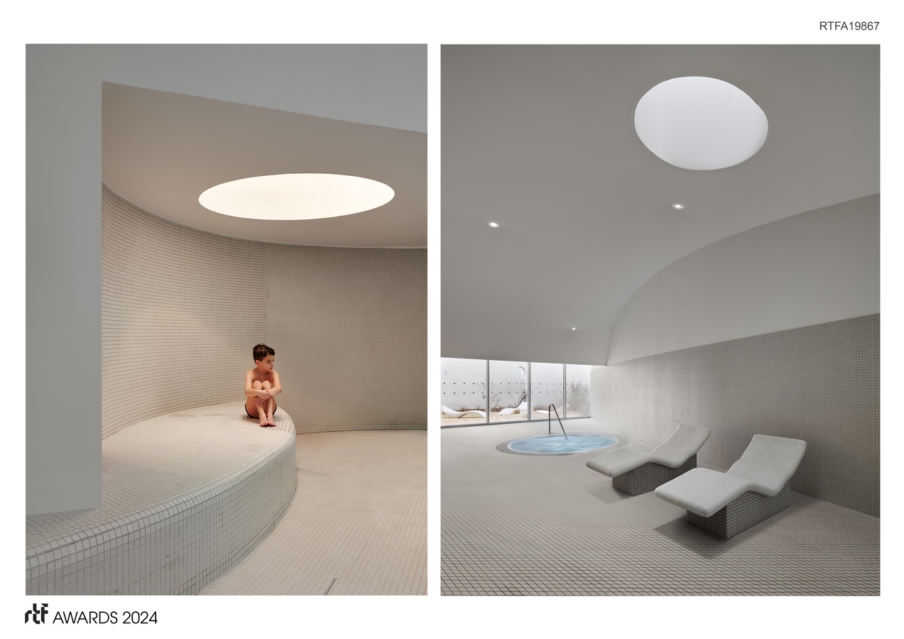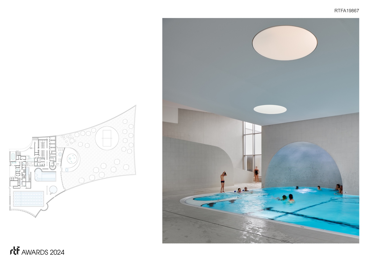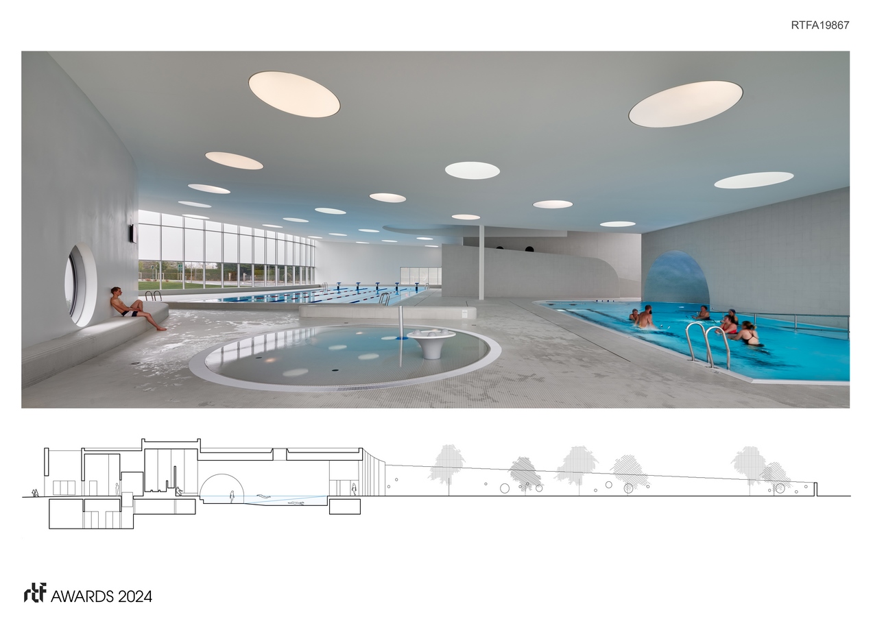 The edifice plays the demanding role of signalling its presence while creating a new landscape. Its long white walls stretch afar and seem to reflect the skyline. The outline of this structure is lunar and dreamlike. It unfolds in the middle of fields, its series of concave lines culminating by the entrance to the town. With perspective, its curved walls, which extend over a hundred metres, reach spellbinding slenderness and a mesmerising scale. These elevations enclose the complex’s outdoor spaces and glide up to the building’s highest point to house the largest pools within a double height. The roof follows these walls, so it naturally slopes with them.