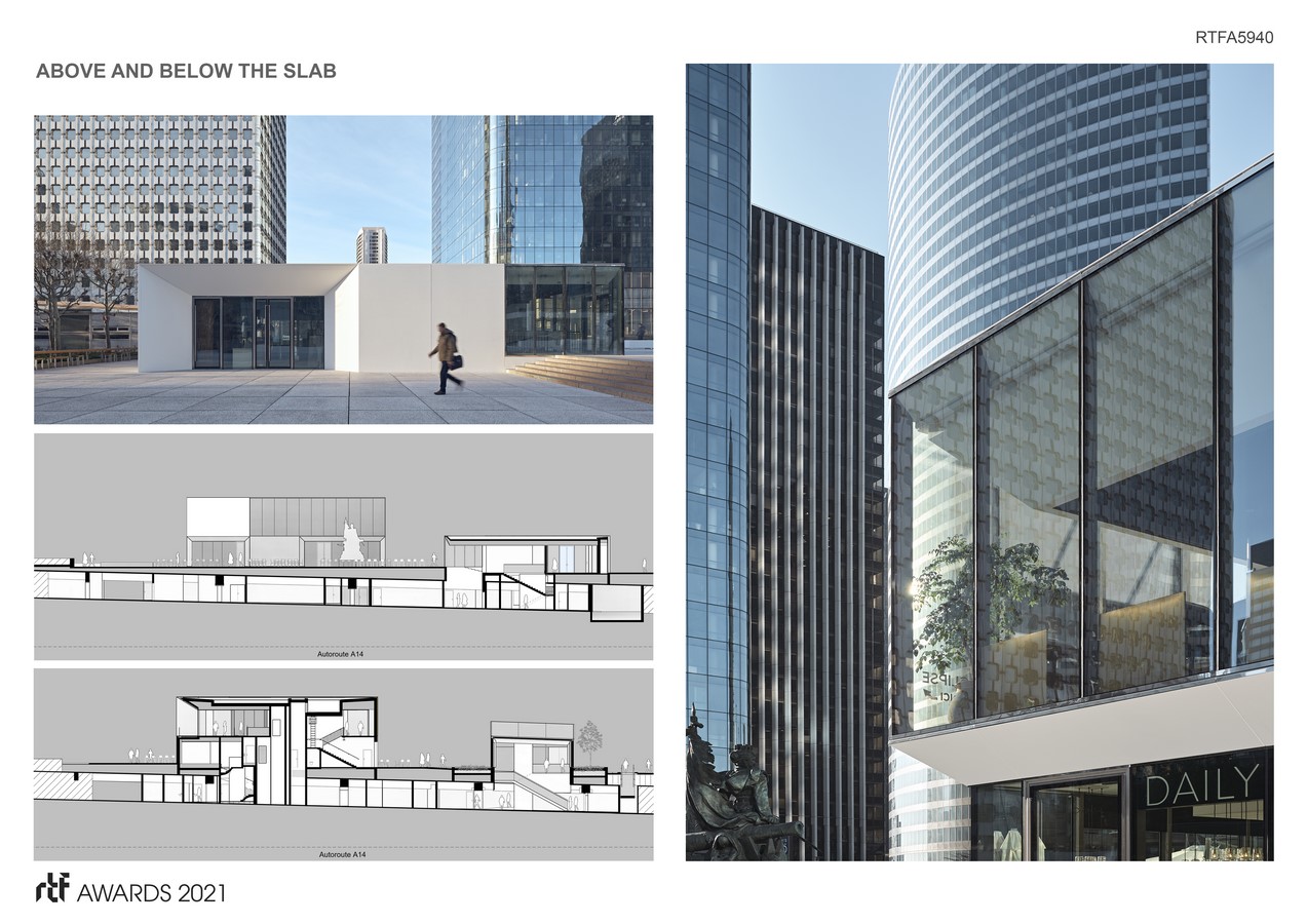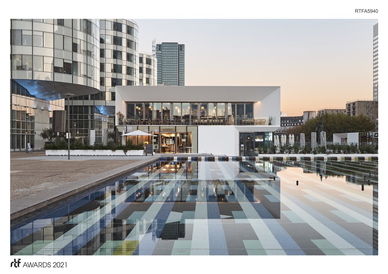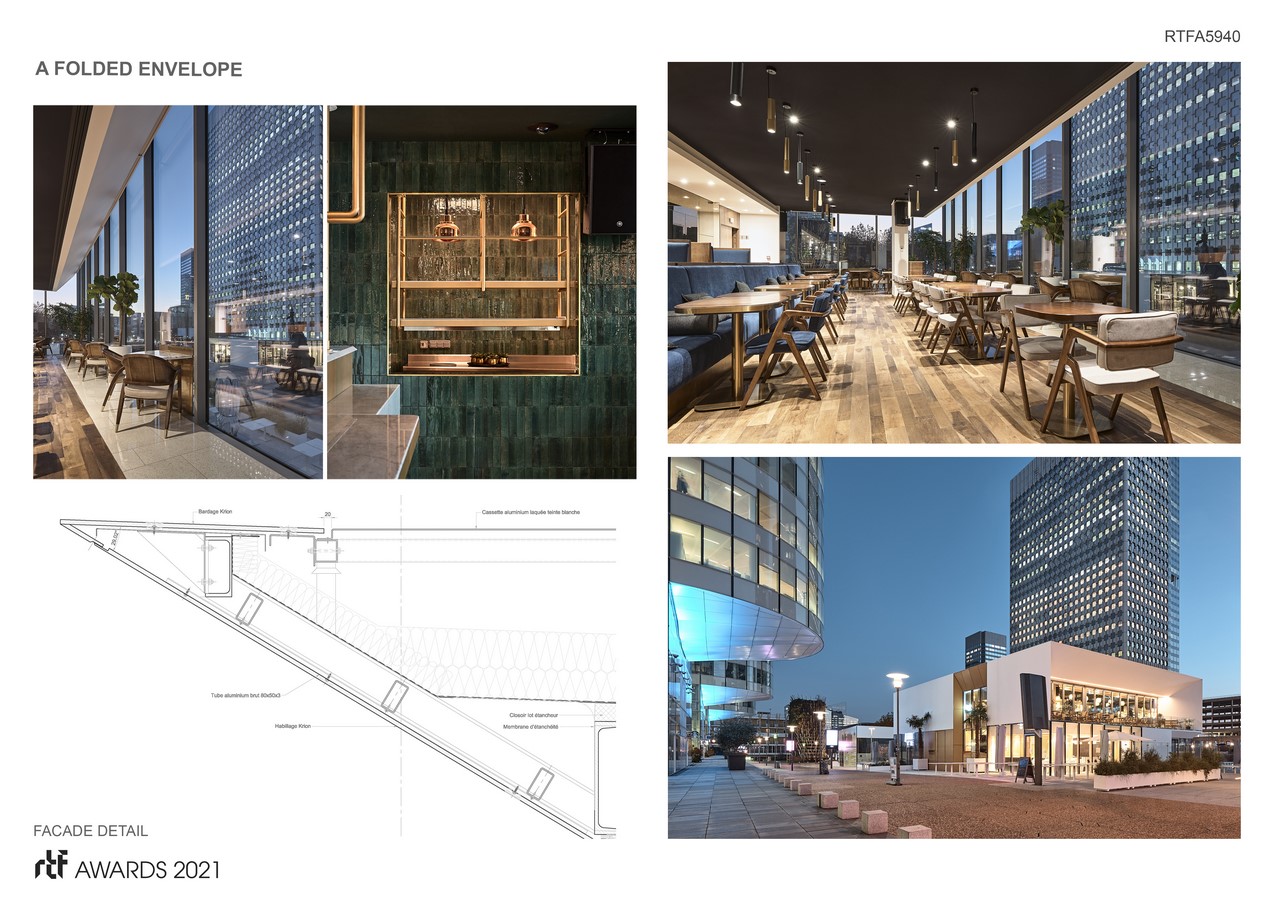 Tablesquare, located on the Esplanade de la Défense, is a place dedicated to gastronomy. Composed of three independent buildings, each is located partly above and below the slab level. Accommodating restaurants, lounges and commercial spaces, they take advantage of lower level patios created by the partial removal of the slab to give light to generous spaces, bright and protected from the noisy activity of the esplanade.