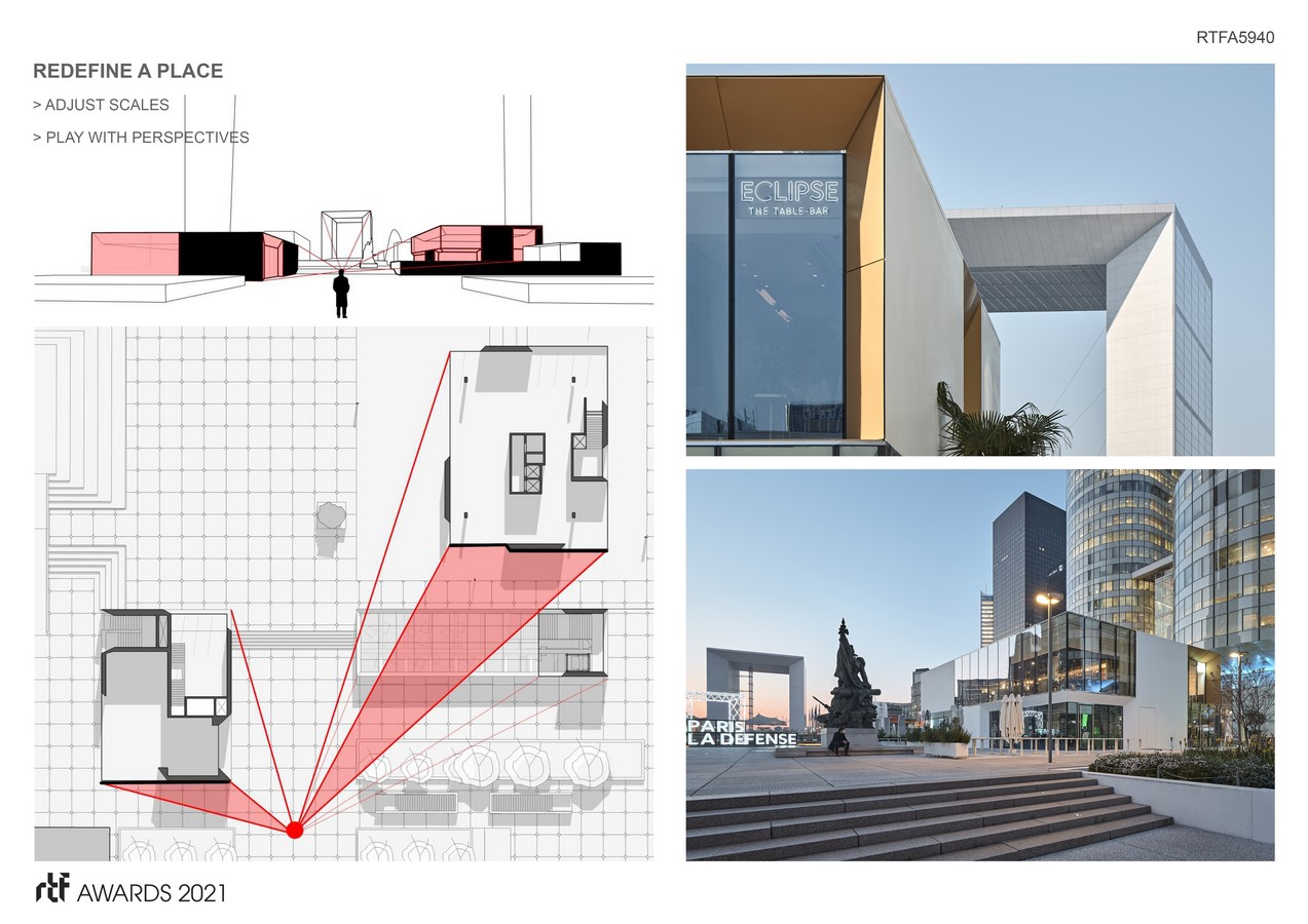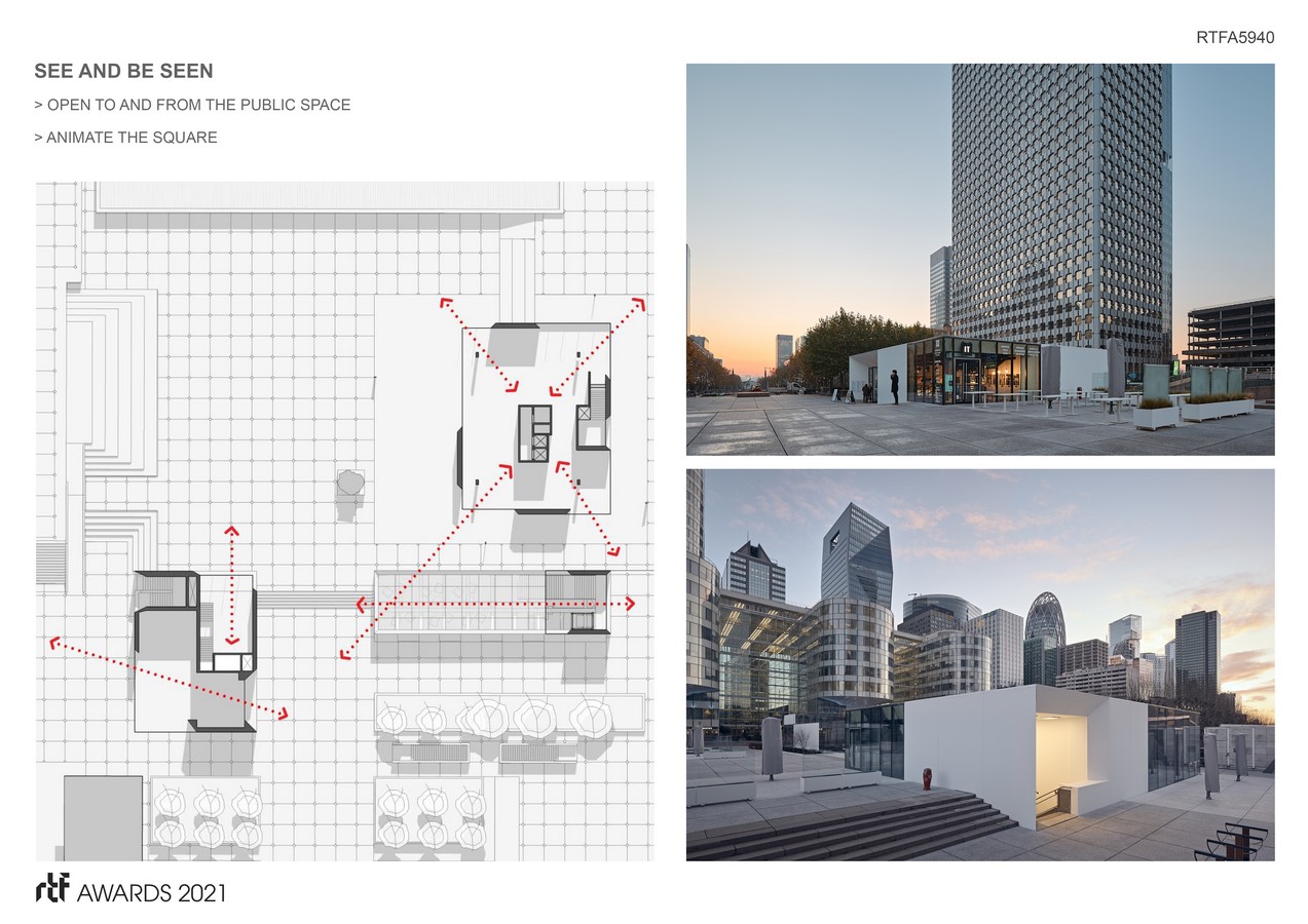 Through large glass facades, the interior spaces contribute to the animation of the square, to the spectacle of the square and attract the eye. The activity of the restaurants, staged, reflects a domestic scale that contrasts with that of the towers lining the esplanade. From the inside, the large openings in truncated “cones” frame the views of the major elements of the site – Grande Arche, skyline of the towers – offering a new perspective on the esplanade of La Défense.