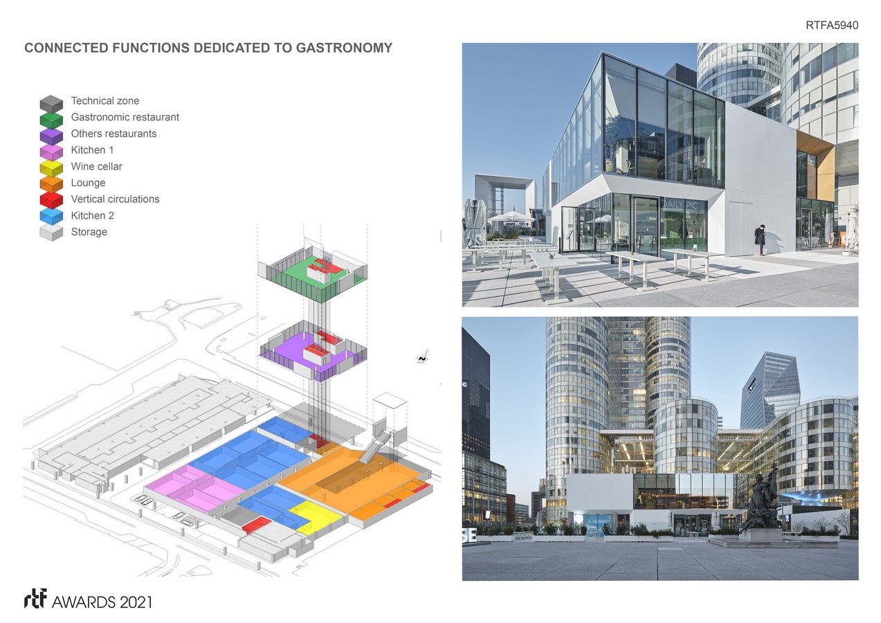 The removed portion of the slab makes it possible to visually link the towers and the “under slab” of La Défense. This program responds to a twofold challenge: to create a restaurant offer of quality, and to demonstrate that it is possible to make the most of the forsaken spaces under the slab (former parking lots). Moreover, the project results from the long feasibility study carried out on tens of thousands of square metres currently unused in the business district basement. The project is a manifesto of the re-use of neglected spaces. By reusing abandoned parking lots under the slab, the project avoided the emission of about 600 tons of carbon equivalent. This choice of location presents major challenges: a limited allowed overload of the slab and reduced available clear heights.