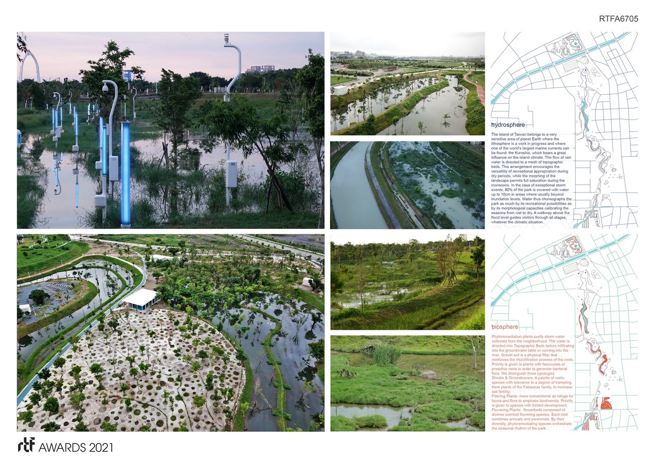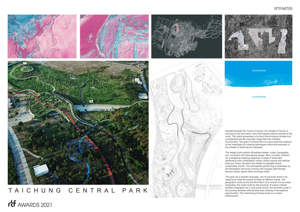 Situated beneath the Tropic of Cancer, the climate of Taiwan is warmed by the Kuro-Shio, one of the largest marine currents in the world. The island possesses a hot and humid tropical climate that counterbalances the mountain range that has a fresher environment. The goal of Central Park is to give back the outdoors to the inhabitants by creating landscapes where the excesses of the climate of Taichung are re shaped.