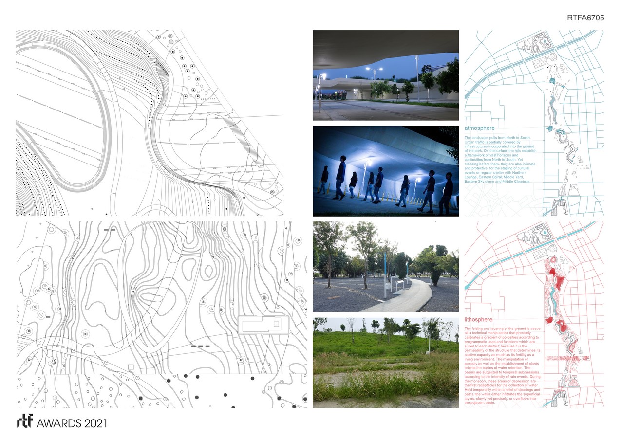 The landscape pulls from North to South. Urban traffic is partially covered by infrastructures incorporated into the ground of the park. On the surface the hills establish a framework of vast horizons and continuities from North to South. Yet standing before them, they are also intimate and protective, for the staging of cultural events or regular shelter with Northern Lounge, Eastern Spiral, Middle Yard, Eastern Sky dome and Middle Clearings.