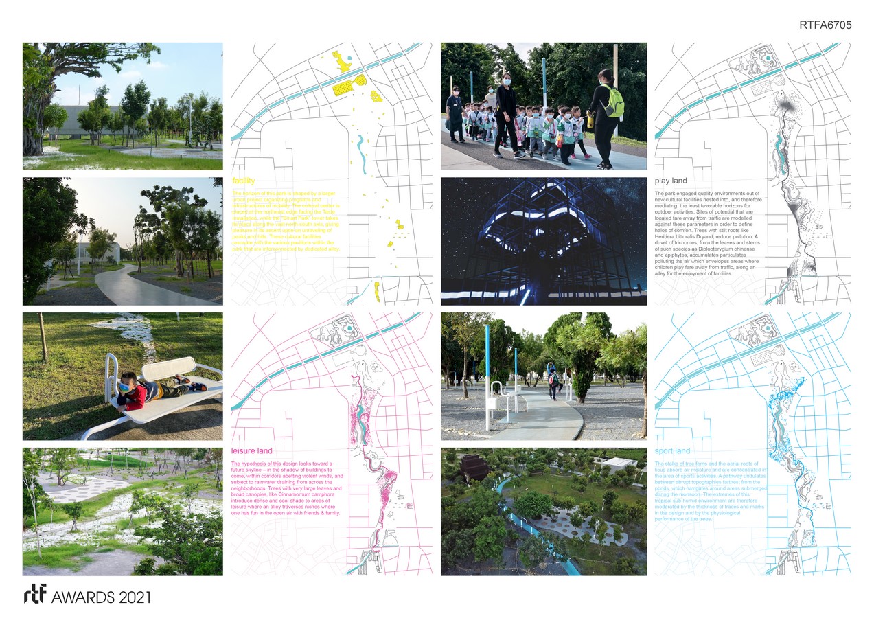 The park acts as a moderator: it proposes a variety of beaches, of gardens, of places and offer to the people of Taichung sensual experiences, partly based on the principle of senses of Rudolf Steiner, with twelve Fields -Speech, Taste, Hearing, Equilibrium, Thinking, Vision, Movement, Ego, Touch, Warmth, Smell, Life- providing visitors with places of gaming, meeting or just walk around powerful landscapes