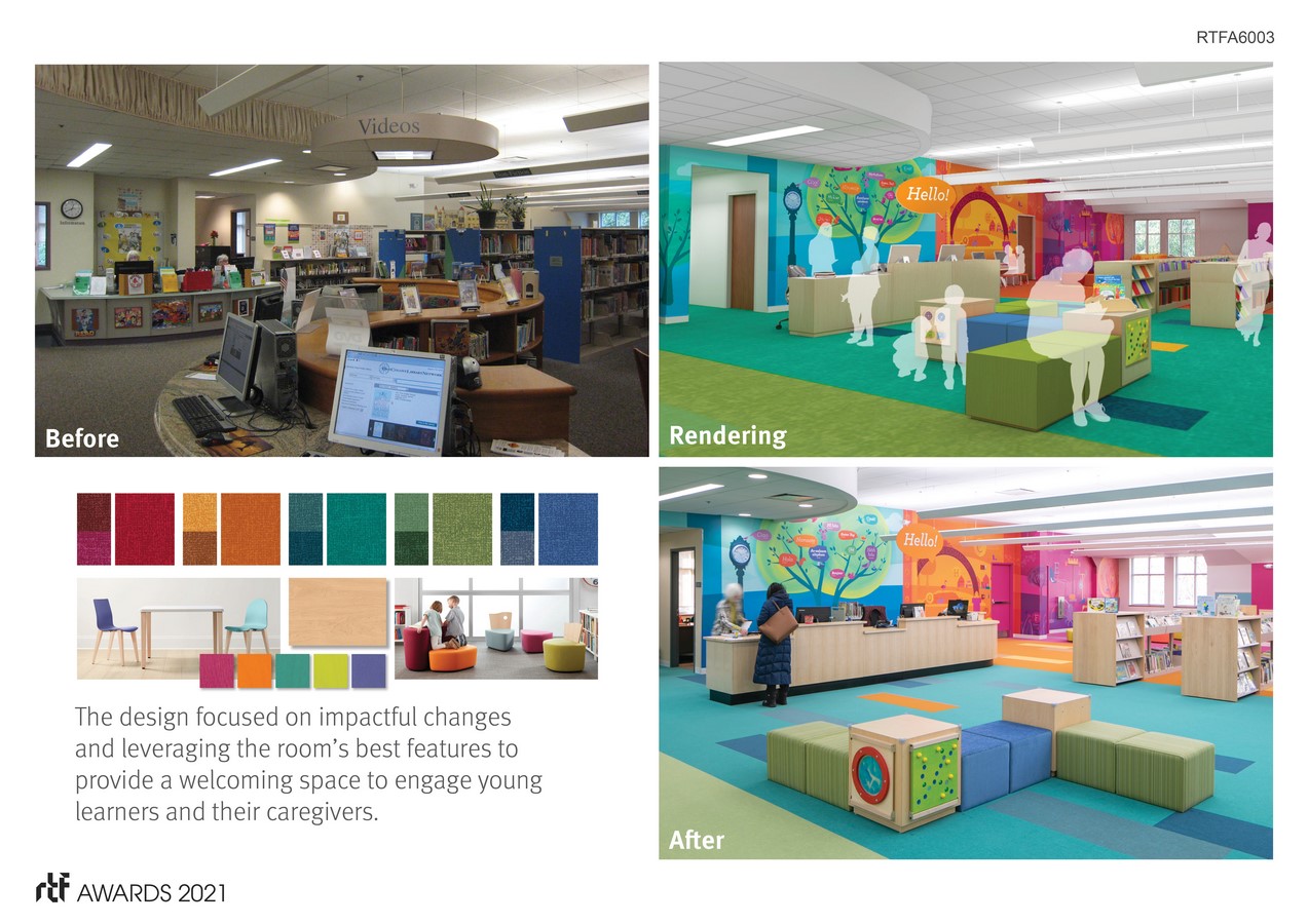 The client wanted a vibrant, interactive, and inviting space but had a limited budget. The interior design provides this by focusing on impactful changes and leveraging the room’s best features to offer a welcoming space to engage young learners and their caregivers.